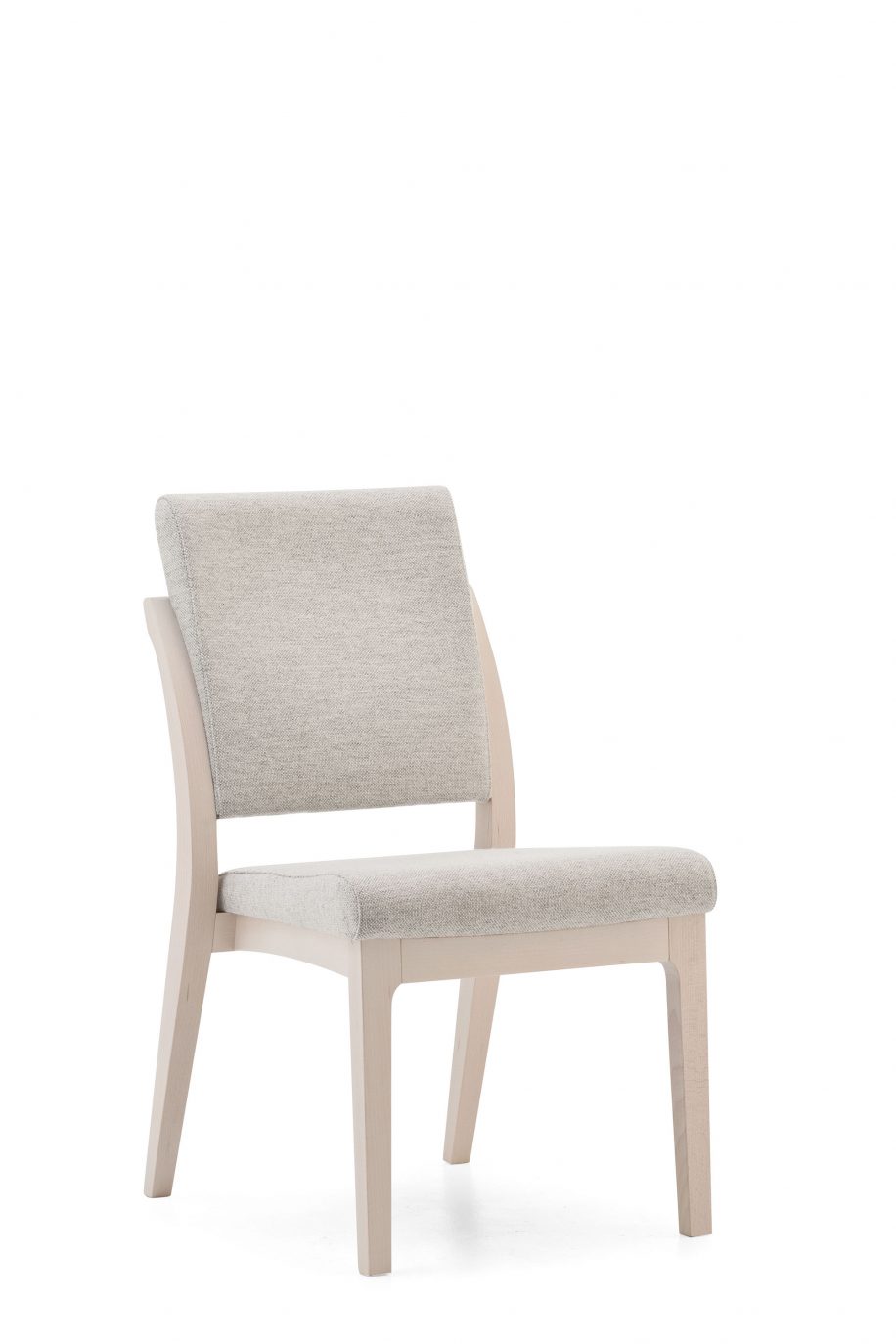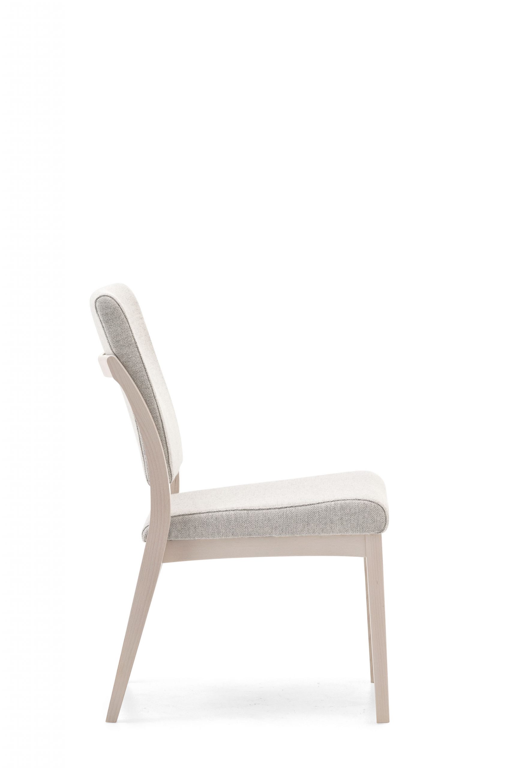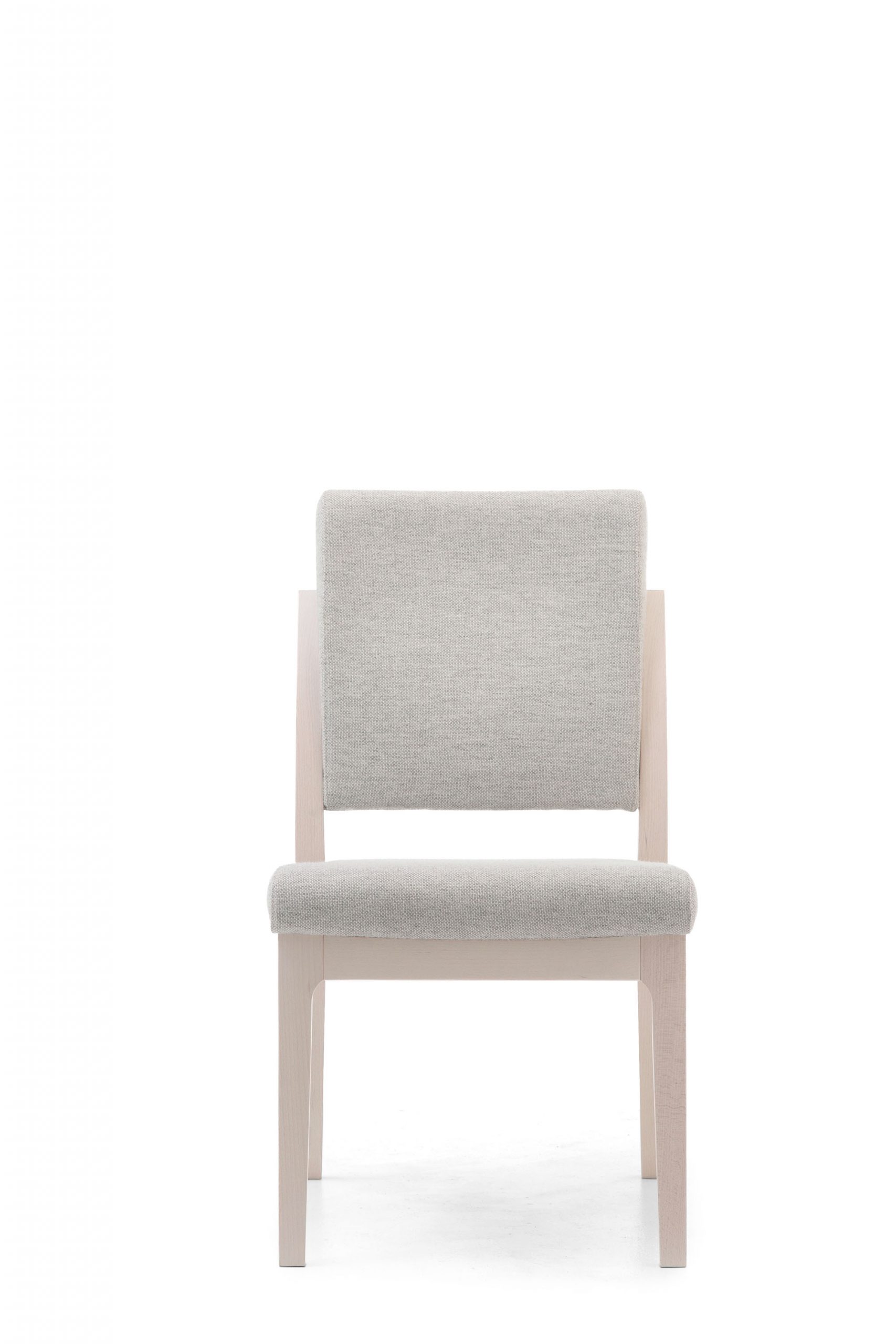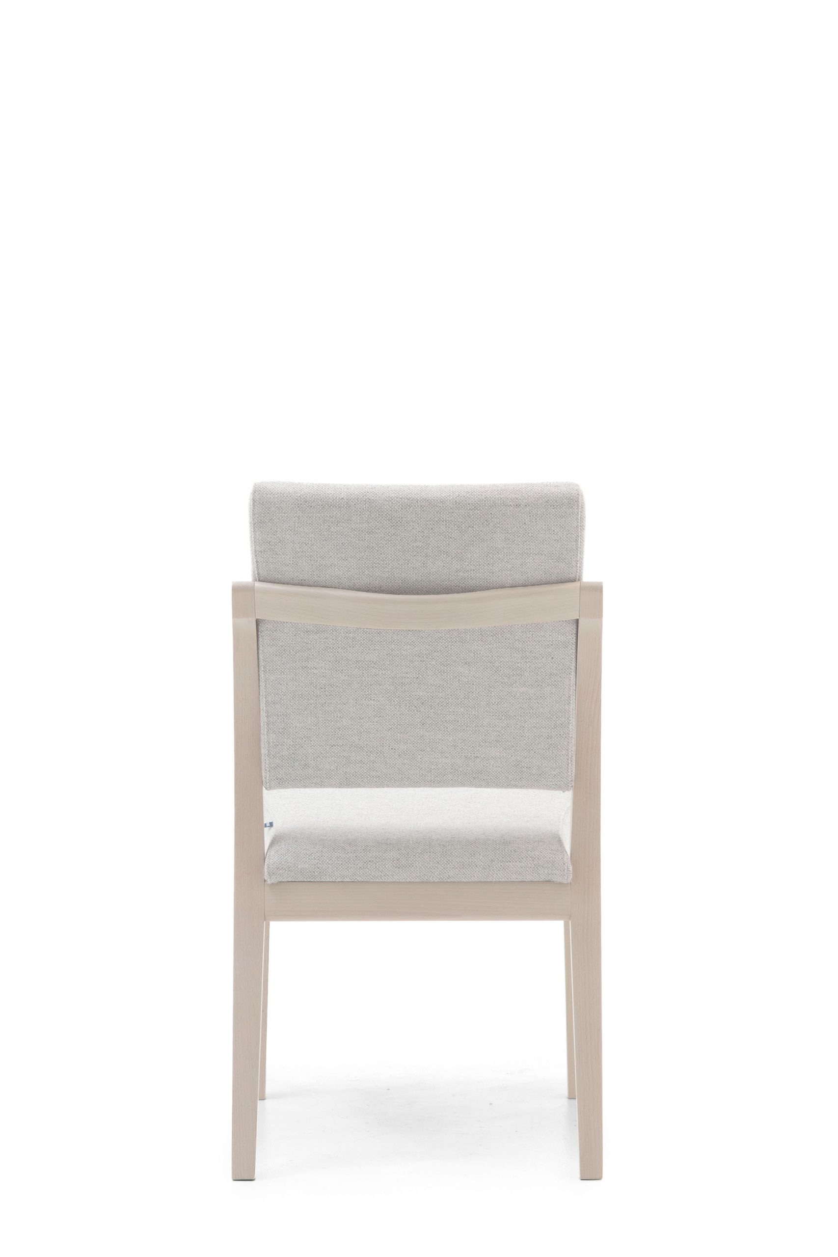 Chaise. Assise et dossier rembourrés. La structure en bois qui encadre le dossier dessine une poignée confortable pour la manipulation. Empilable.