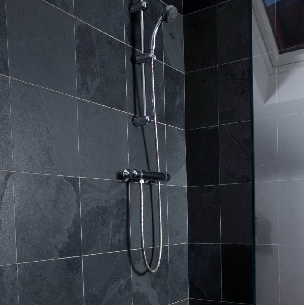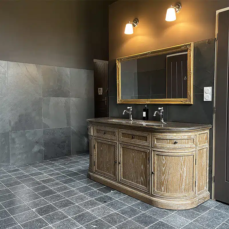 Découvrez notre dallage Ardoise Noire moirée. Ce dallage en ardoise naturelle possède de jolis veinages et une surface lisse et matte. Il possède également des chants sciés, cela signifie que ces bords sont droits. Ce dallage convient parfaitement aux pièces intérieures et peut aussi bien se poser au sol qu’au mur. Il peut donc se poser en faïence murale dans une salle de bain par exemple. Sa couleur noire intense apportera beaucoup de chic et de cachet à votre aménagement.