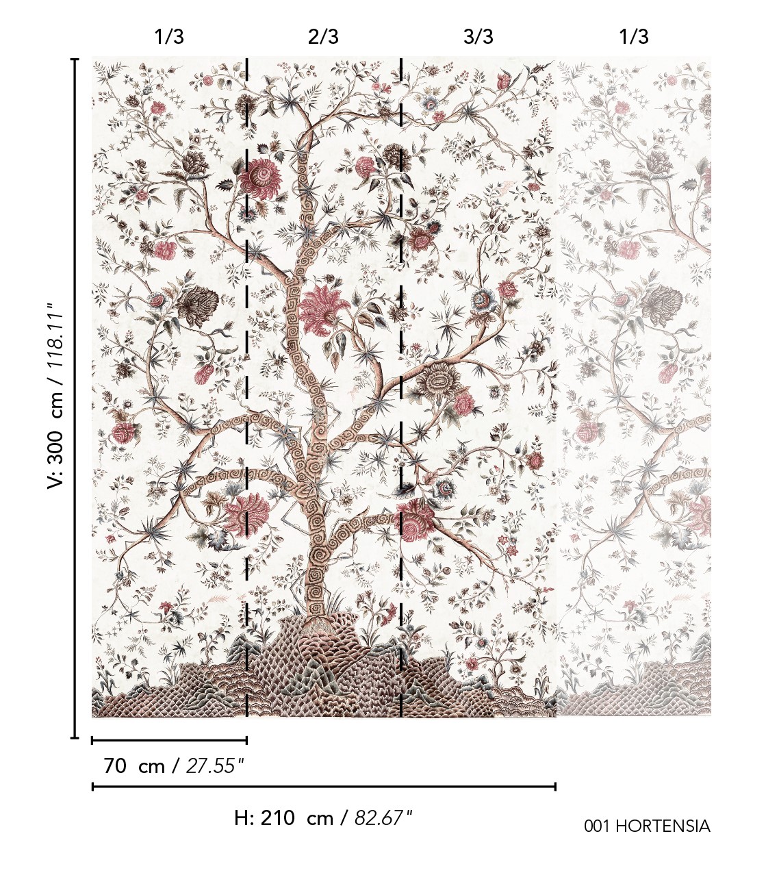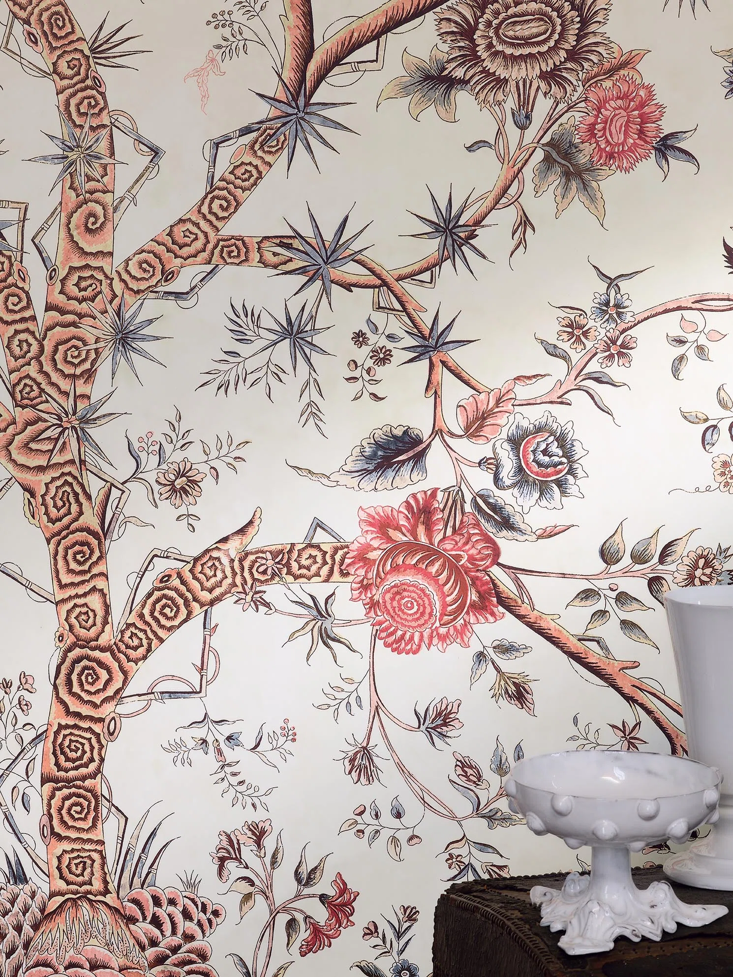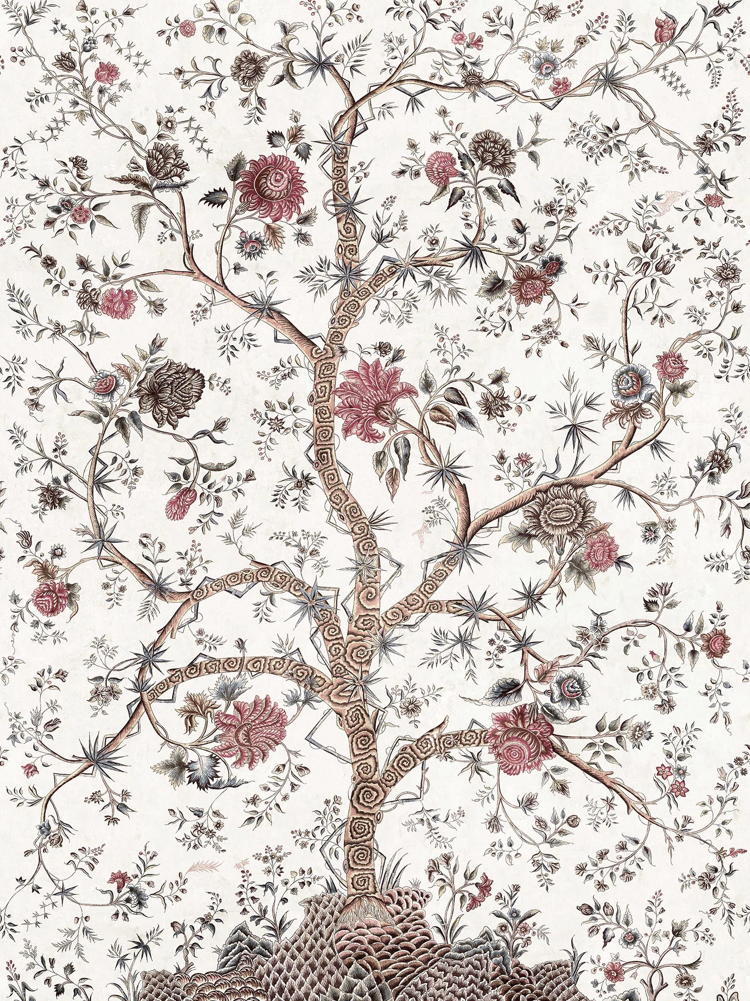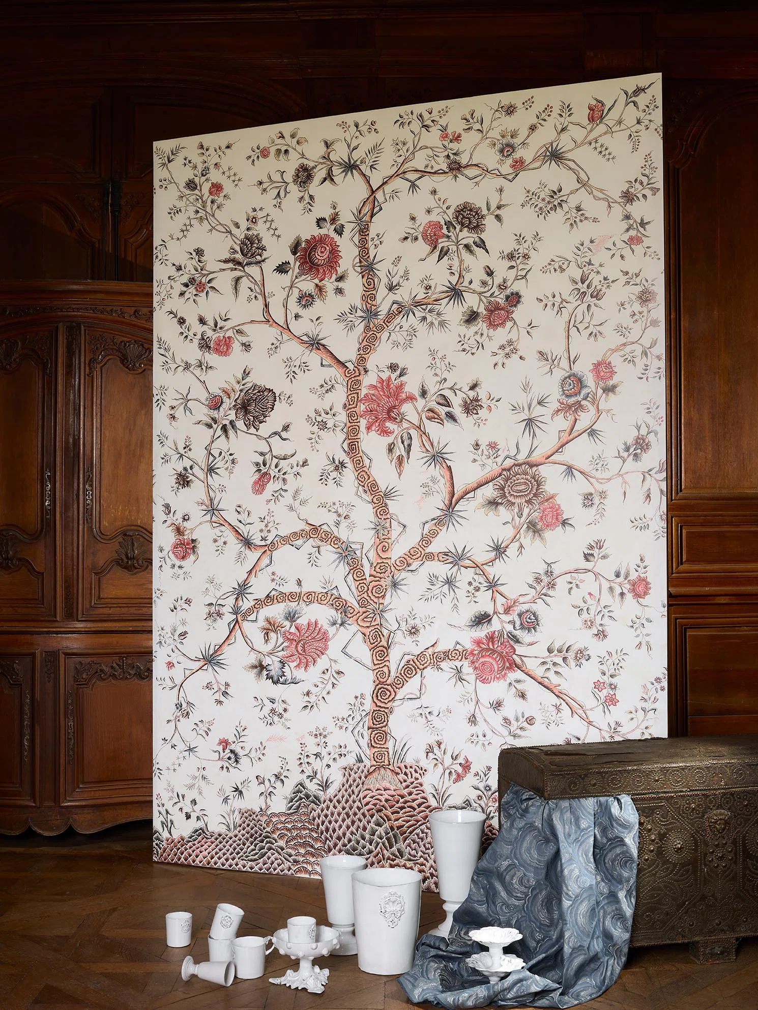 Ce panneau reproduit un palempore indien au motif d’arbre de vie très en vogue à la fin du XVIIe siècle et au XVIIIe siècle dans les intérieurs européens. Il est ici imprimé sur un intissé de qualité à l’effet satiné. Existe également en tissu dans une autre coloration.
