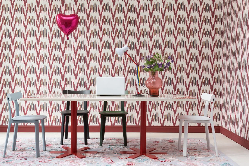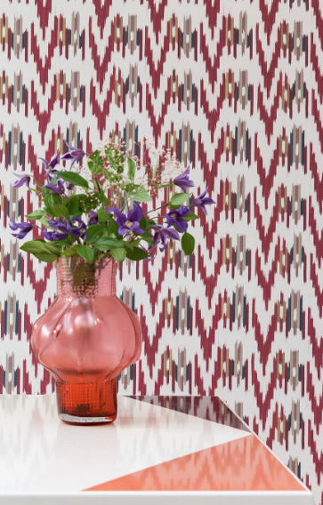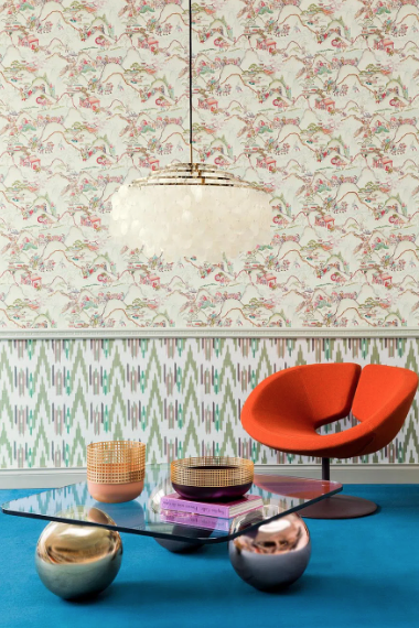 L’ODISSI s'inspire d'une impression sur chaîne du 19e siècle. Le document d'origine est conservé dans les archives de la Maison Pierre Frey. Papier peint imprimé sur soie contrecollée SHIVA BP334.