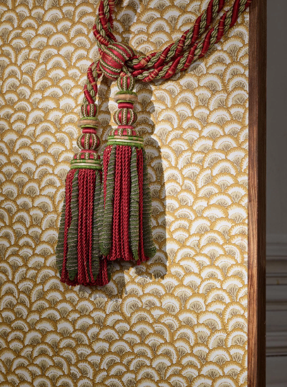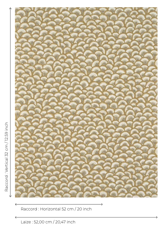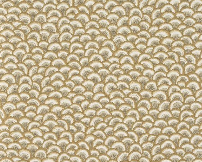 Motif d’écailles imbriquées typique des tertres des arbres de vie indiens du XVIIIe siècle. L’impression traditionnelle au cylindre retranscrit parfaitement l’esprit artisanal des productions indiennes imprimées à la planche de bois. Le dessin coordonné existe également en broderie et en panneau imprimé.