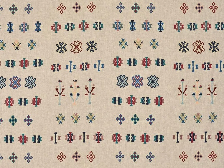 Authentique et intemporelle, cette délicate broderie manuelle de jute et de fils laineux réinterprète avec précision une archive de la Maison.