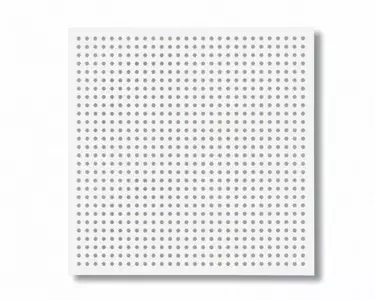 Dalle en plaque de plâtre peinte lisse et à perforations hexagonales et régulières, de bord A (franc), permettant la neutralisation du formaldéhyde dans l'air ambiant.