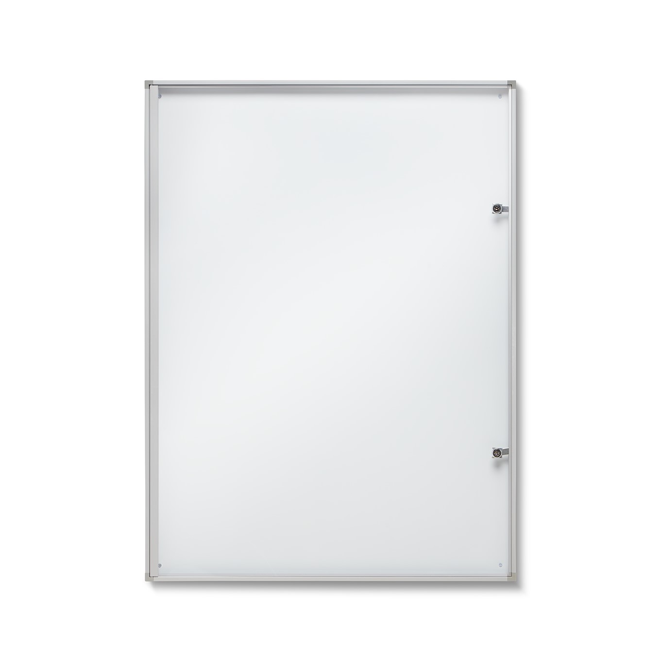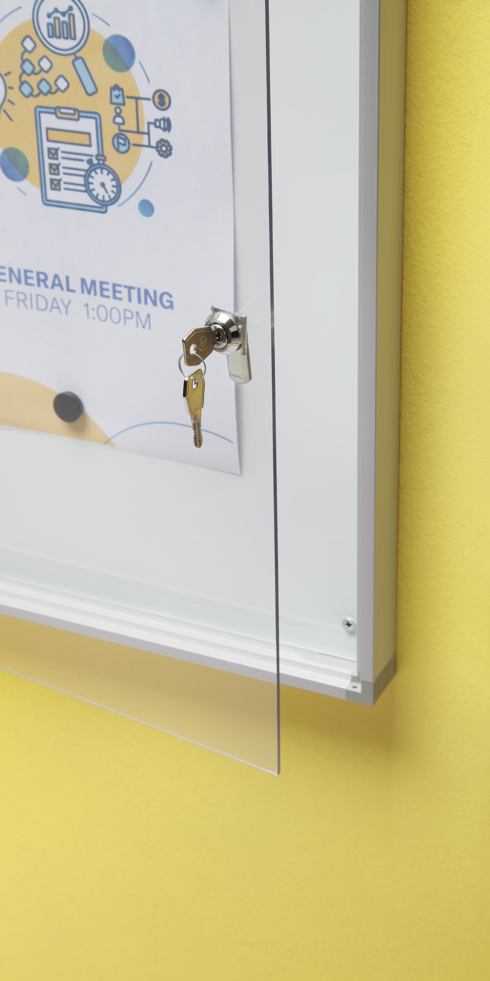 Collection de vitrines Basic fabriquées avec profilé en aluminium anodisé argent mat et équipées de coins d'angle gris arrondis. Porte d'ouverture pivotante transparente en méthacrylate avec serrure et clé. Disponible dans une finition magnétique blanche étiquetable pour aimants et en liège naturel pour contenir les avis et les notes à l'aide d'aiguilles ou de punaises. Valises à usage intérieur.