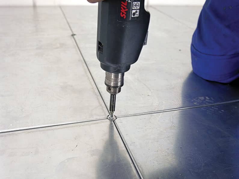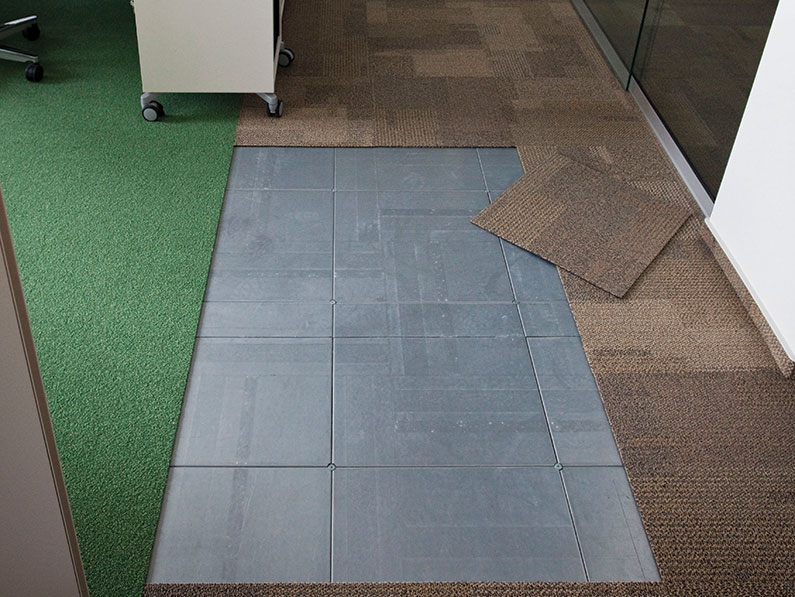 Le système peut être combiné avec des dalles de moquette. Après avoir installé Intercell, l’installation des dalles de moquette est rapide et facile.