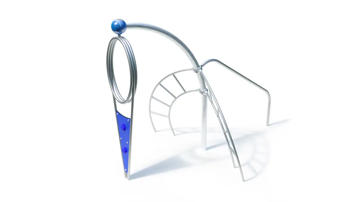 Combinaison de jeux à grimperPoteau central: tube coudé 90° en acier galvanisé, ø114x3,6mm avec sphère ø250mm en aluminium peint - Mur d'escalade: panneau HPL 20mm dans une construction tubulaire en acier inoxydable ø38mm - Barre de glisse: construction soudée en tube d'acier inoxydable ø60,3mm - Echelles arquées: construction soudée en tubes d'acier inoxydable ø38mmDimensions: 4,23 x 2,84 x h2,93m