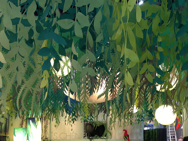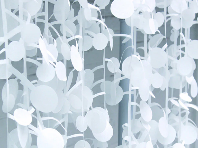 Des découpes raffinées qui peuvent être très complexes et qui constituent des ribambelles de papier qui peuvent servir à décorer différents espaces, sous formes de guirlandes enrubannées autour de troncs d'arbres en carton, ou sous forme de plafonds, etc.