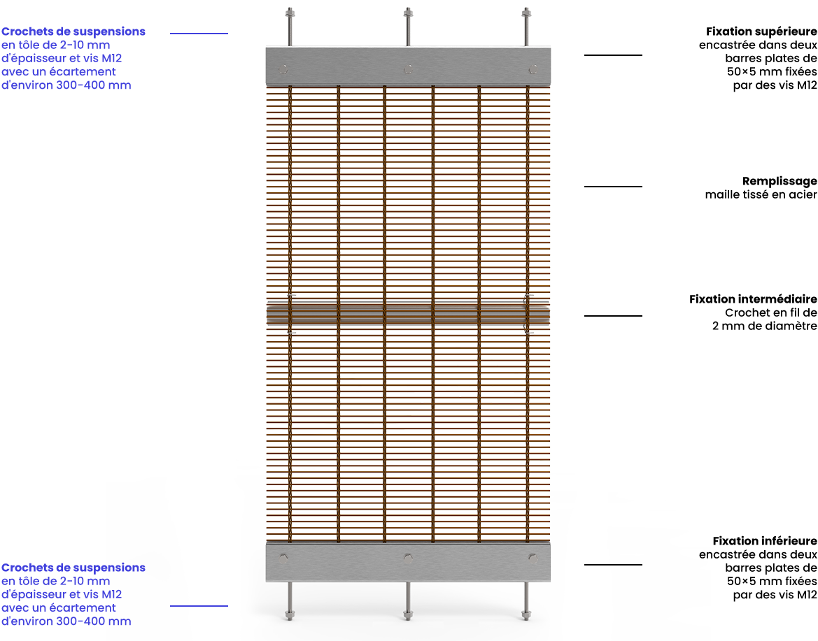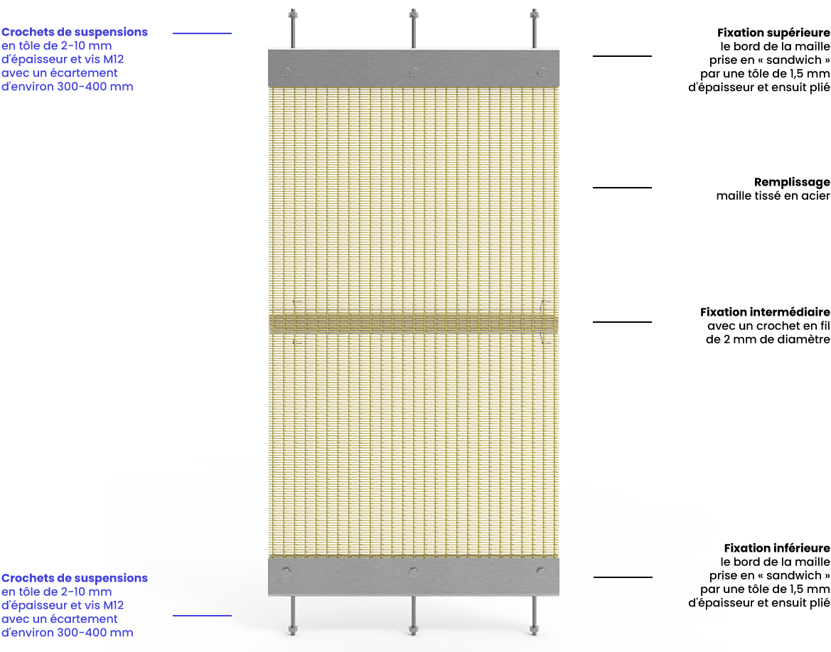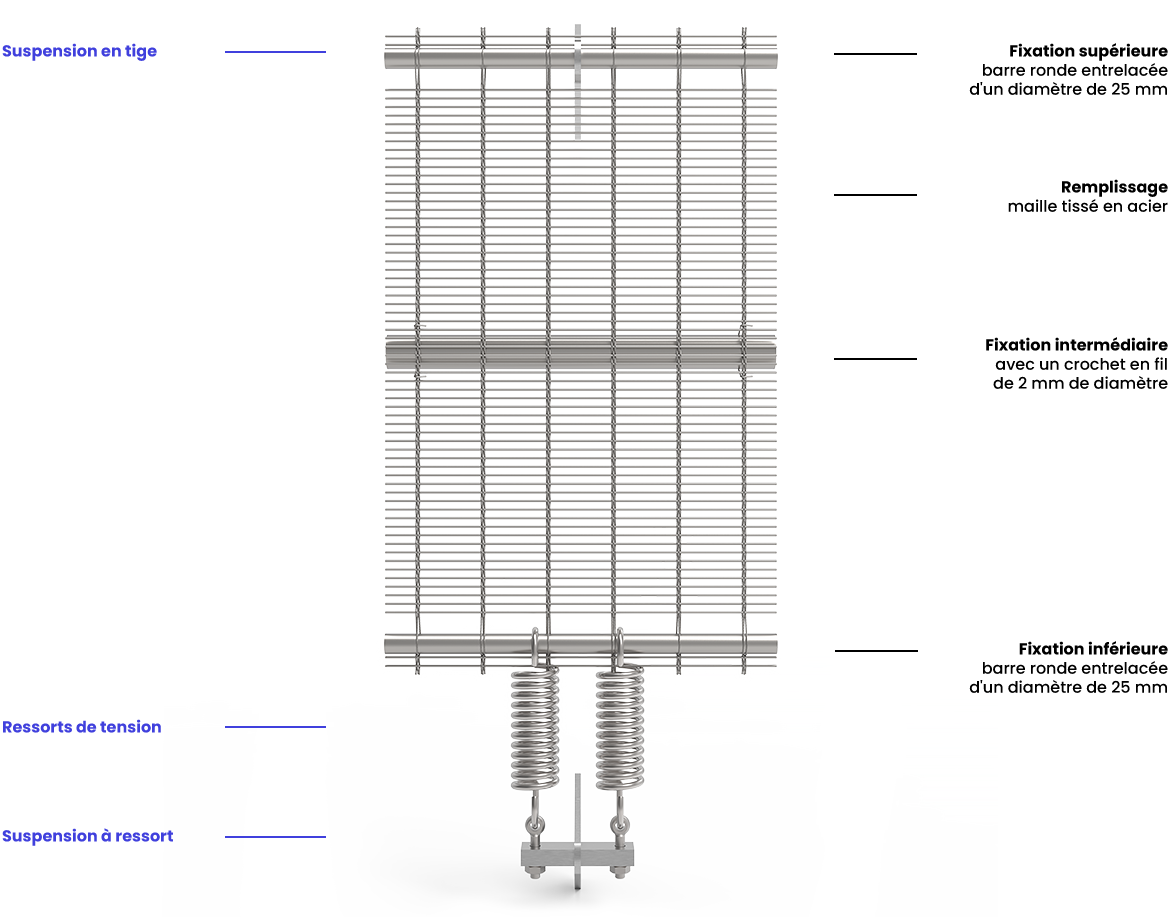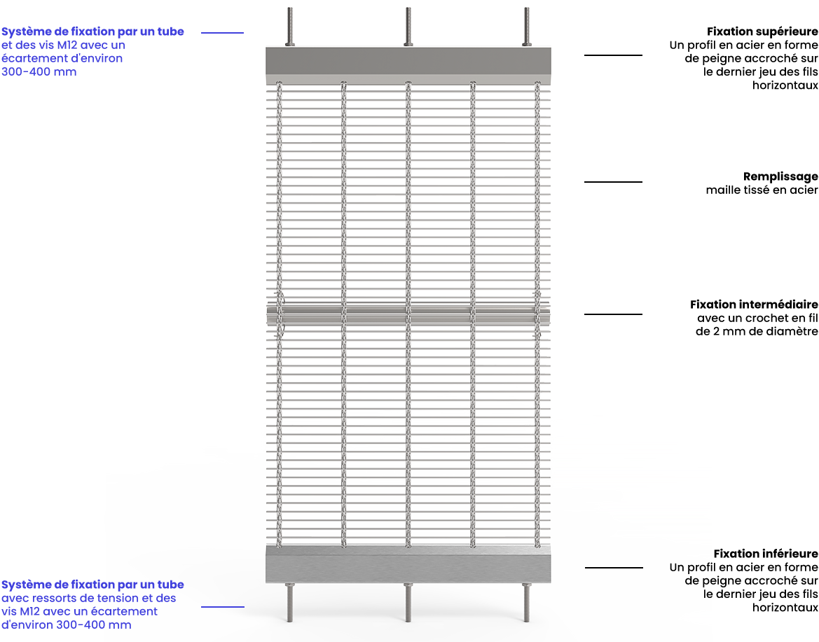 Les systèmes de fixation tendus de PROGRESS ARCHITECTURE sont des solutions sur mesure, conçues principalement pour les mailles tissées et offrant une grande flexibilité d’installation. Une tension verticale et horizontale est possible. Les éléments de montage permettent une installation directe du plafond au sol, du plafond au plafond, du plancher au mur et du mur au mur. Solution complète pour les applications intérieures et extérieures, qui permet une installation efficace tenant compte de l’environnement de pose. Les systèmes sont complétés par des supports intermédiaires, qui sont utilisés en fonction de la longueur et du type de maille. Au sein de cette gamme de fixations, il existe plusieurs autres sous-groupes en fonction de la méthode choisie par le client pour fixer les extrémités de la maille.