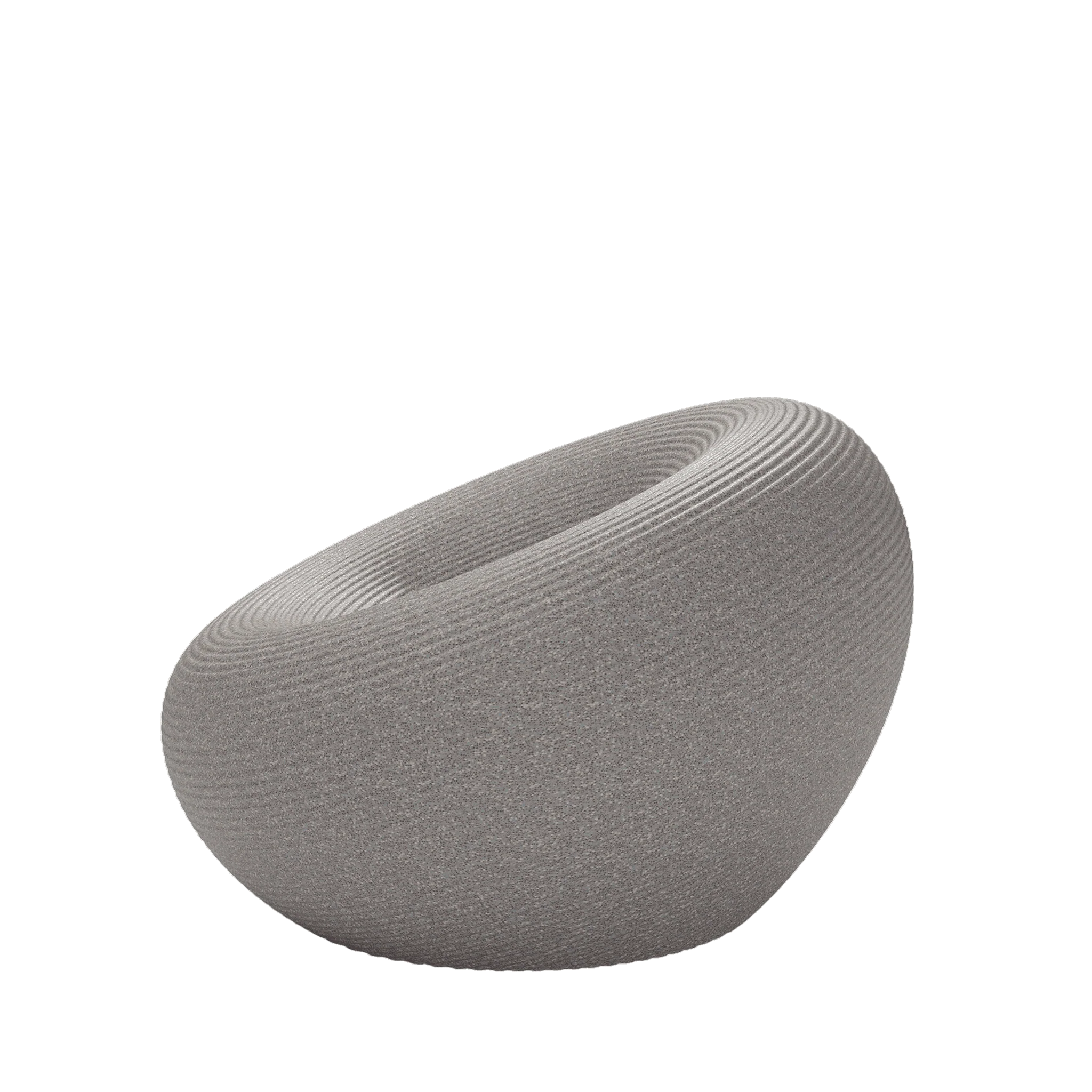 Le fauteuil Nami Mix est obtenu par la rotation d’une section sur l’axe diagonal, il a une forme parfaitement circulaire où les moulures qui caractérisent sa surface s’effilochent du centre vers ses bords avec une séquence d’anneaux concentriques. Au centre du fauteuil se trouve le canal pour le reflux de l’eau. Disponible en six couleurs, trois d’entre elles ont une couleur uniforme, les trois autres sont obtenues à partir du recyclage et du mélange de matériaux avec 2-3 tons de couleurs différents.