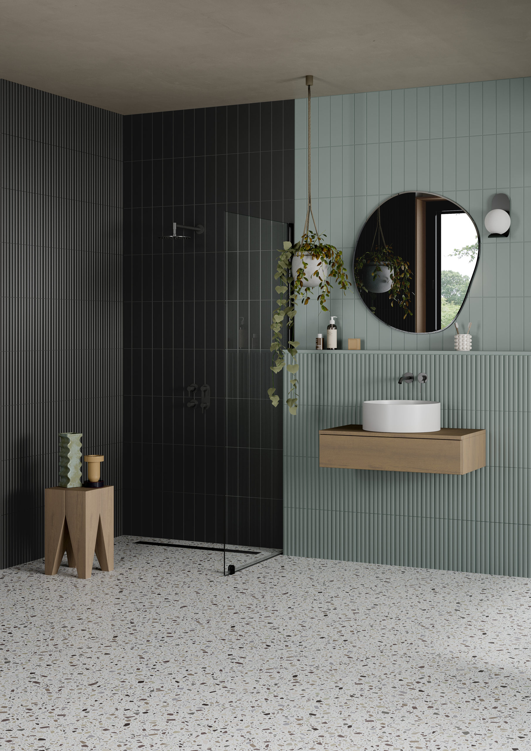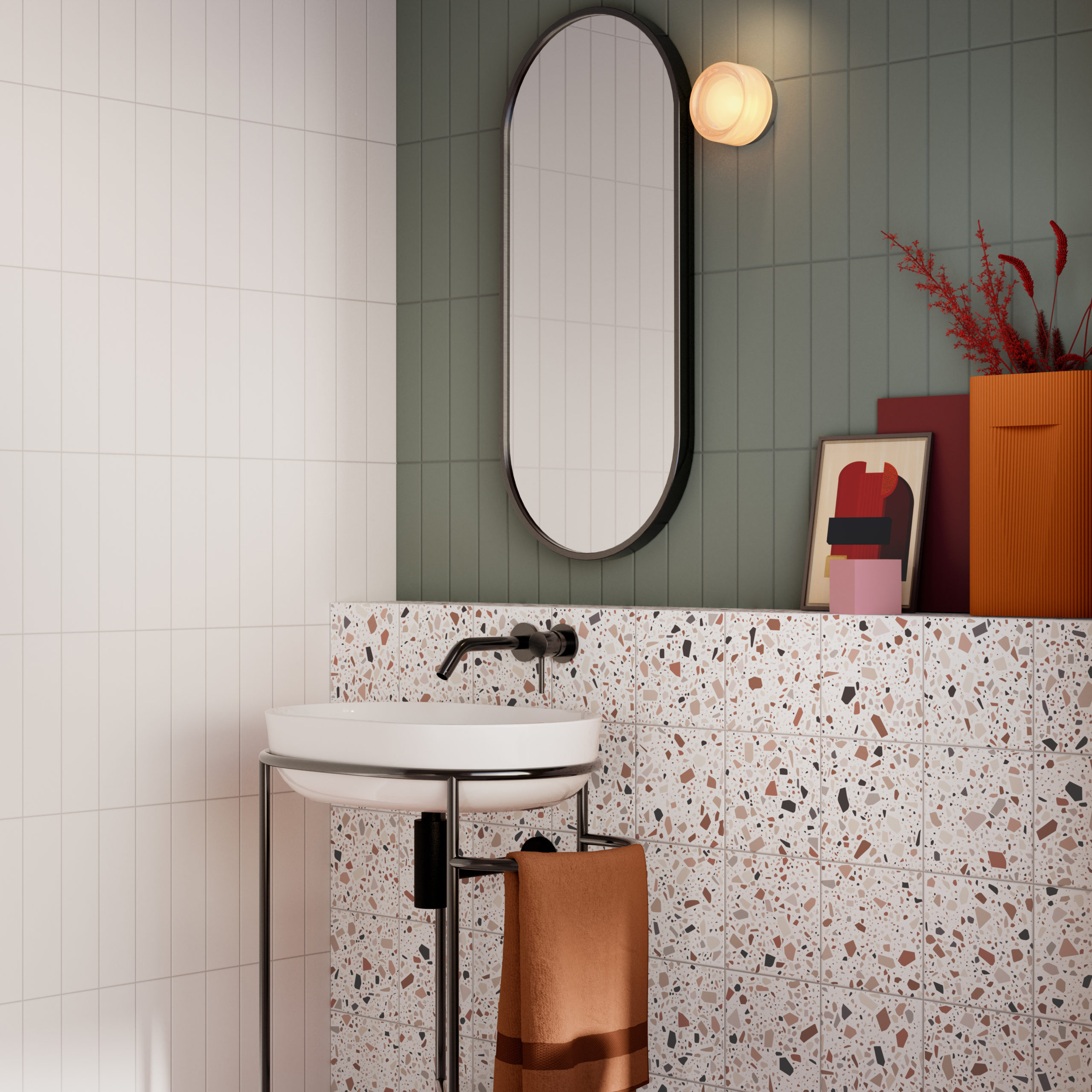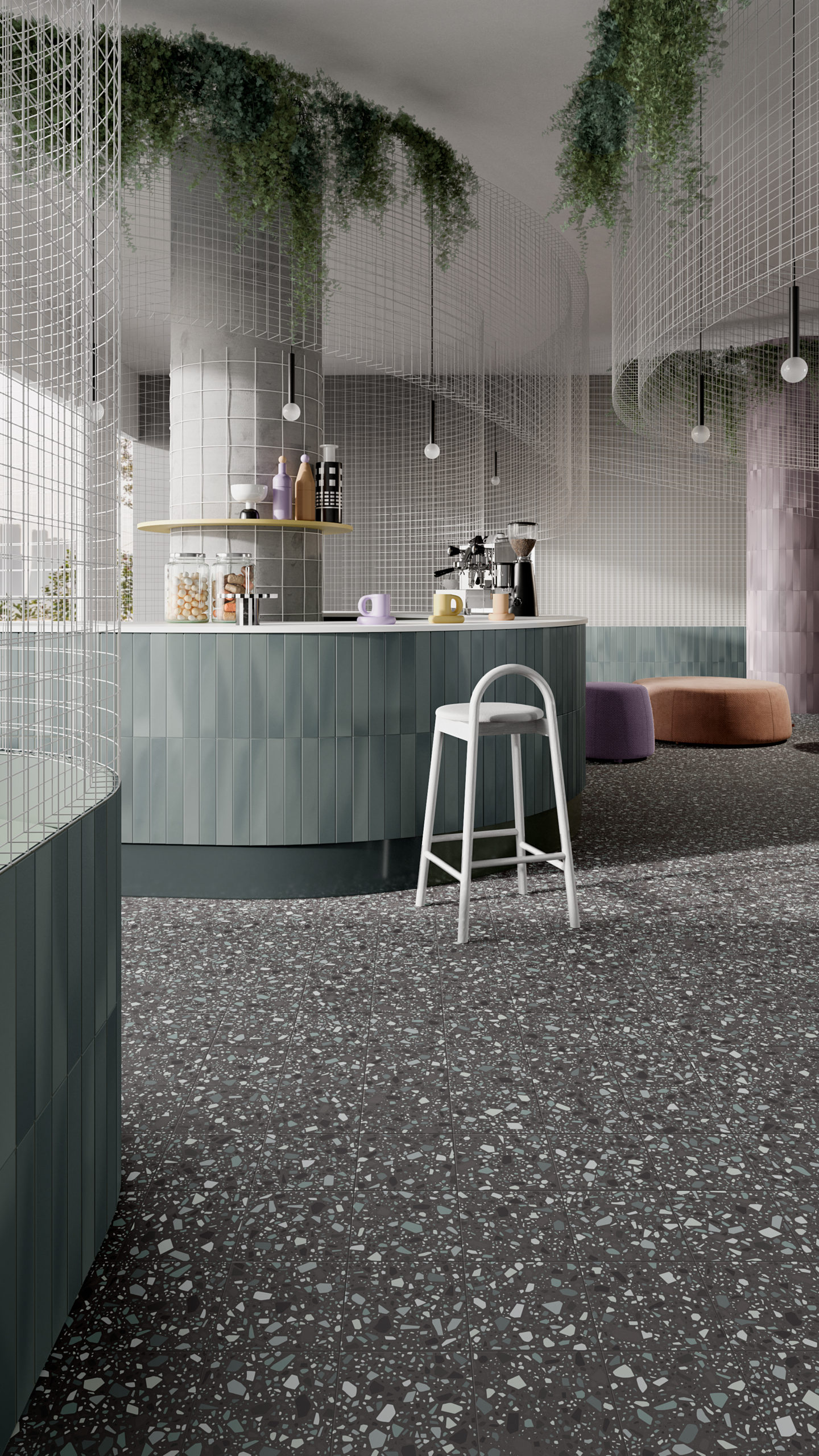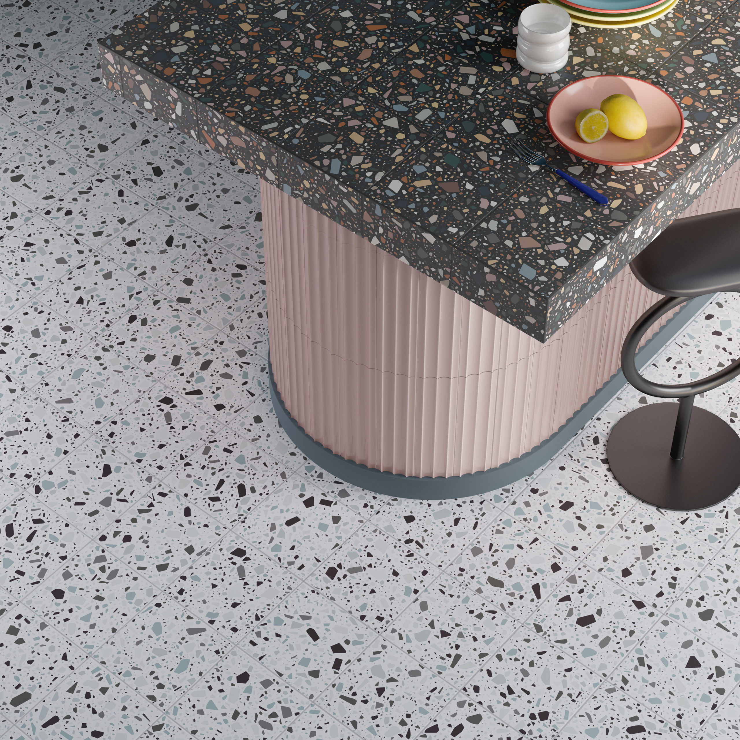 Très contemporaine, la collection Confetti revisite les sols Venetian Terrazzo. Un grès cérame dont la force réside dans son style et ses couleurs qui se marient parfaitement avec les revêtements muraux Quintessenza.