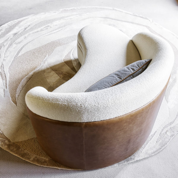 Structure en bois massif. Double coque et passepoils de cuir. Cerclage en laiton. Tissus Lelièvre Paris: Sherpa Craie - Rituel Ardoise. Coussin en option. Fabriqué en Italie.