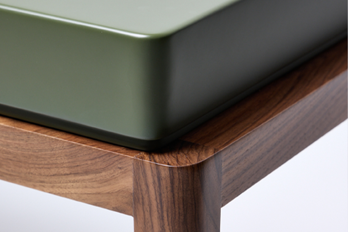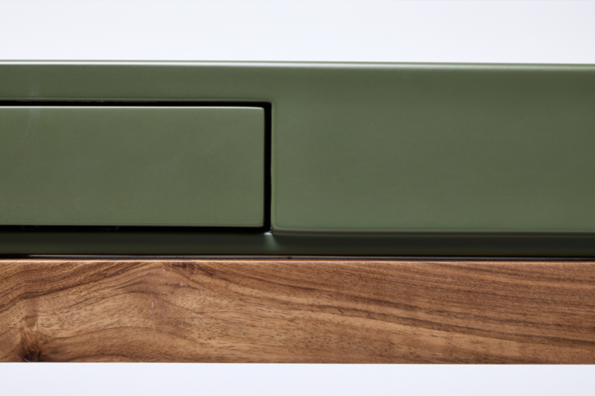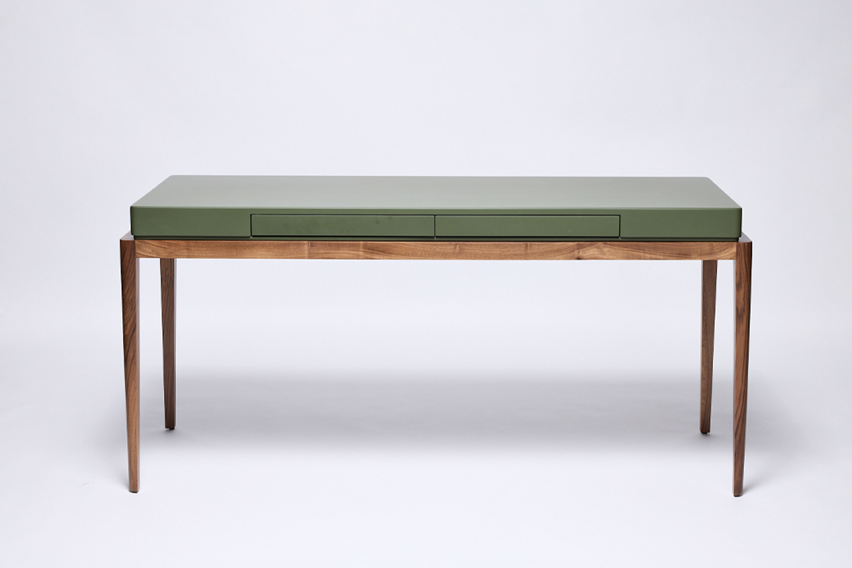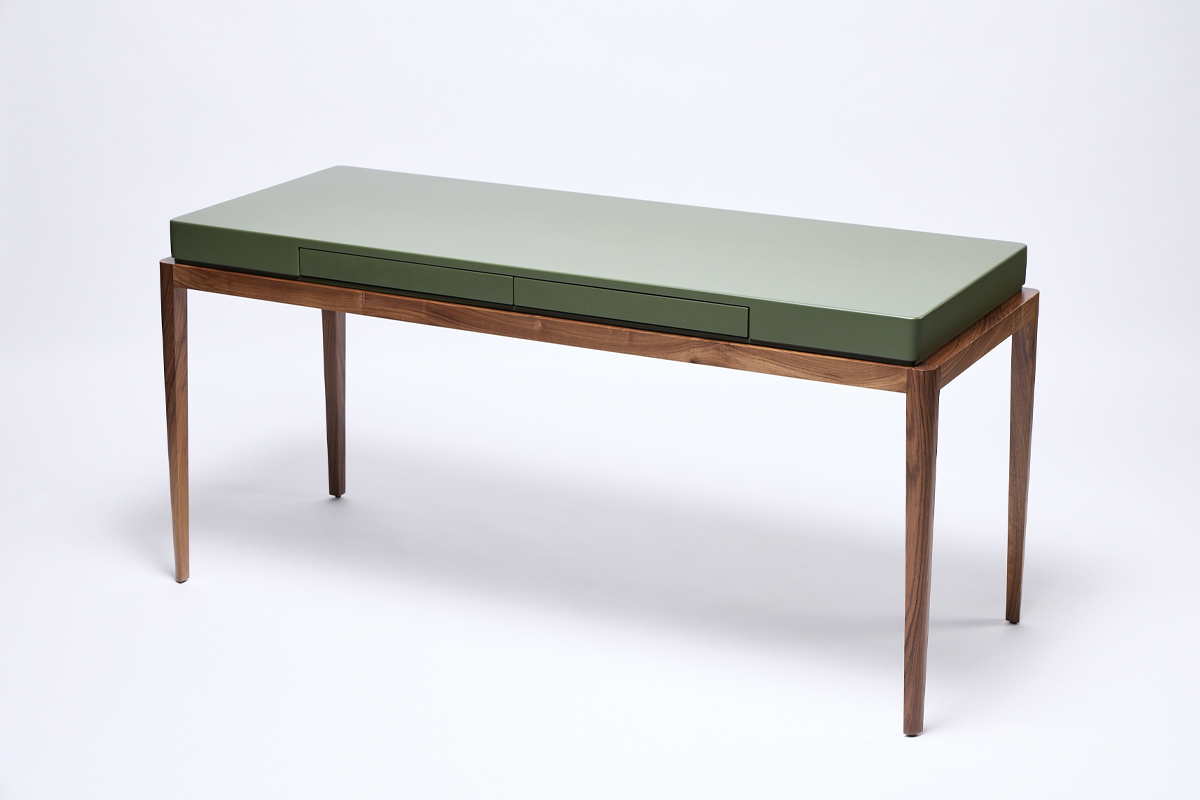 Bureau TARA, 2019 Piétement en noyer américain, Plateau laqué à la main, brillant ou mat 19 couleurs disponibles 140 x 61 x H72 cm 160 x 61 x H72 cm 180 x 61 x H72 cm