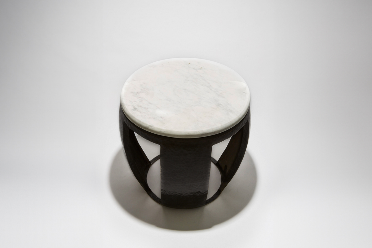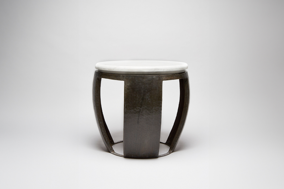 Couleurs, lieux, objets, voyages : nombreuses sont les sources d’inspiration de Reda Amalou. Imprégné par l’Asie, le designer a voulu créer une table d’appoint en écho aux tambours typiques du continent. Chaque pièce est faite main et se compose d’un socle en bronze martelé et surplombé d’un plateau en marbre.