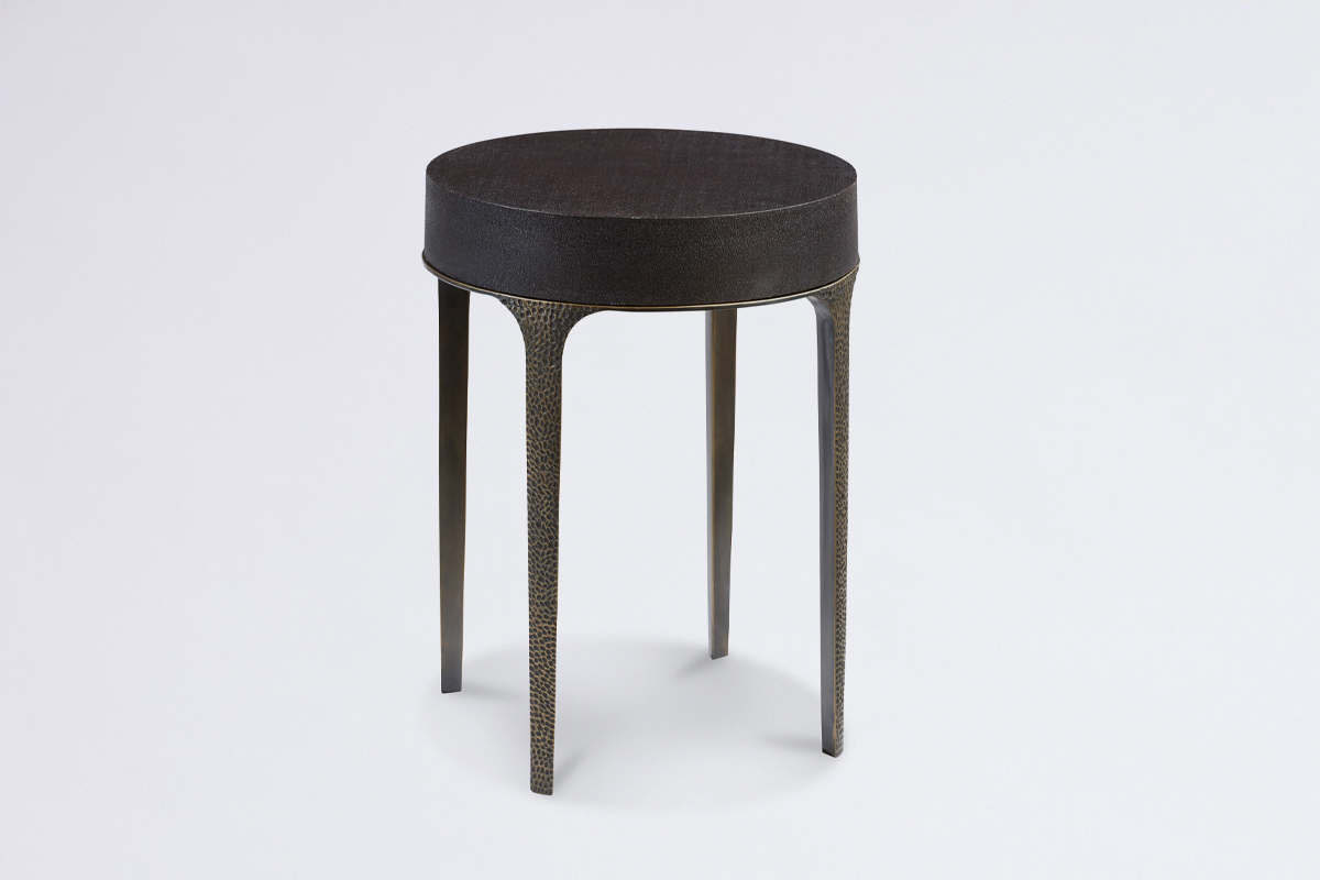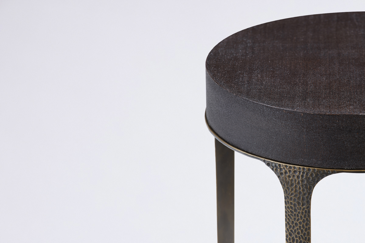 Table d’appoint LADY BUG, 2017 Plateau bois recouvert en gaze puis vernis Piétements en bronze martelé Ø40 x H45 cm