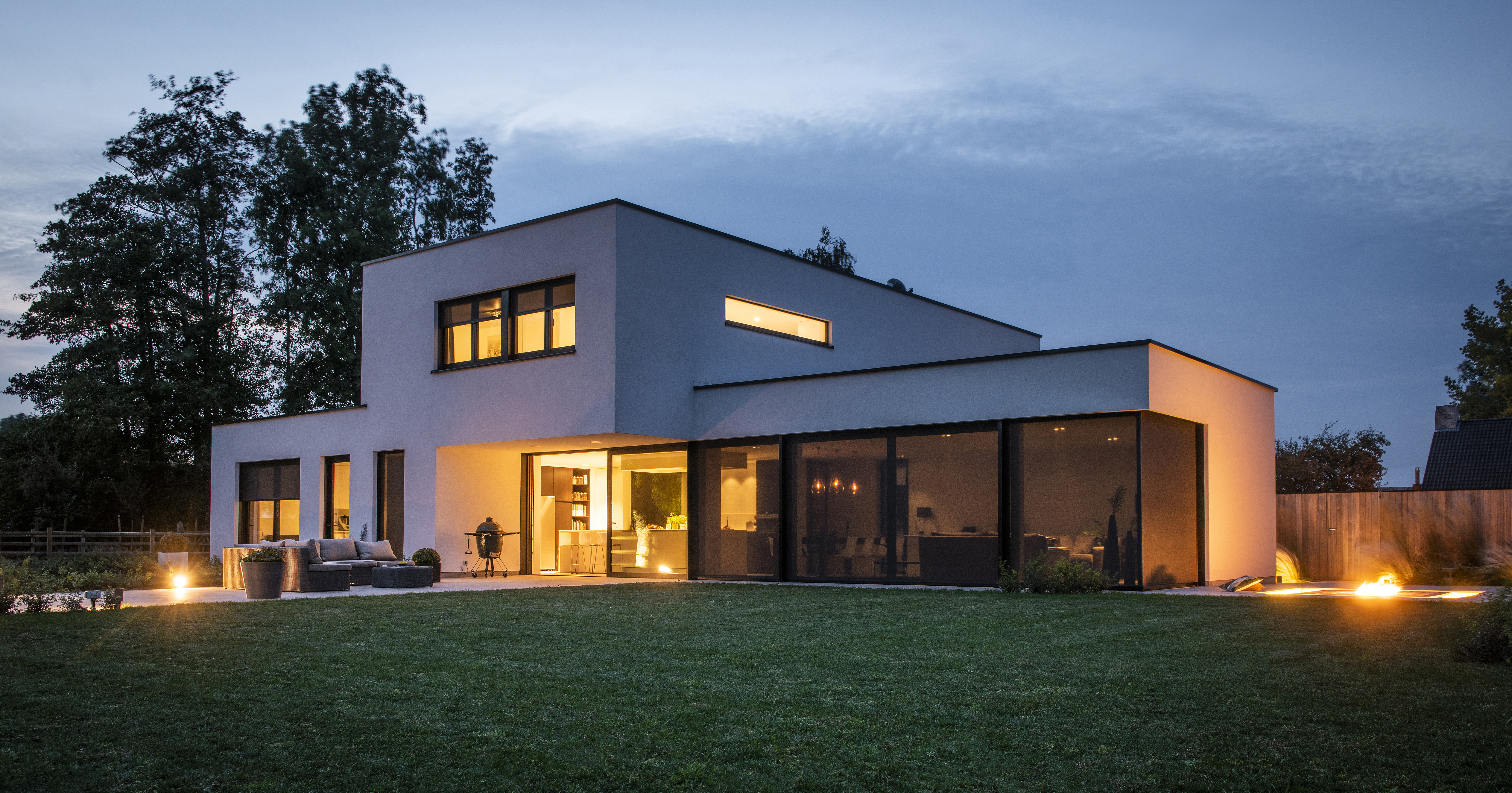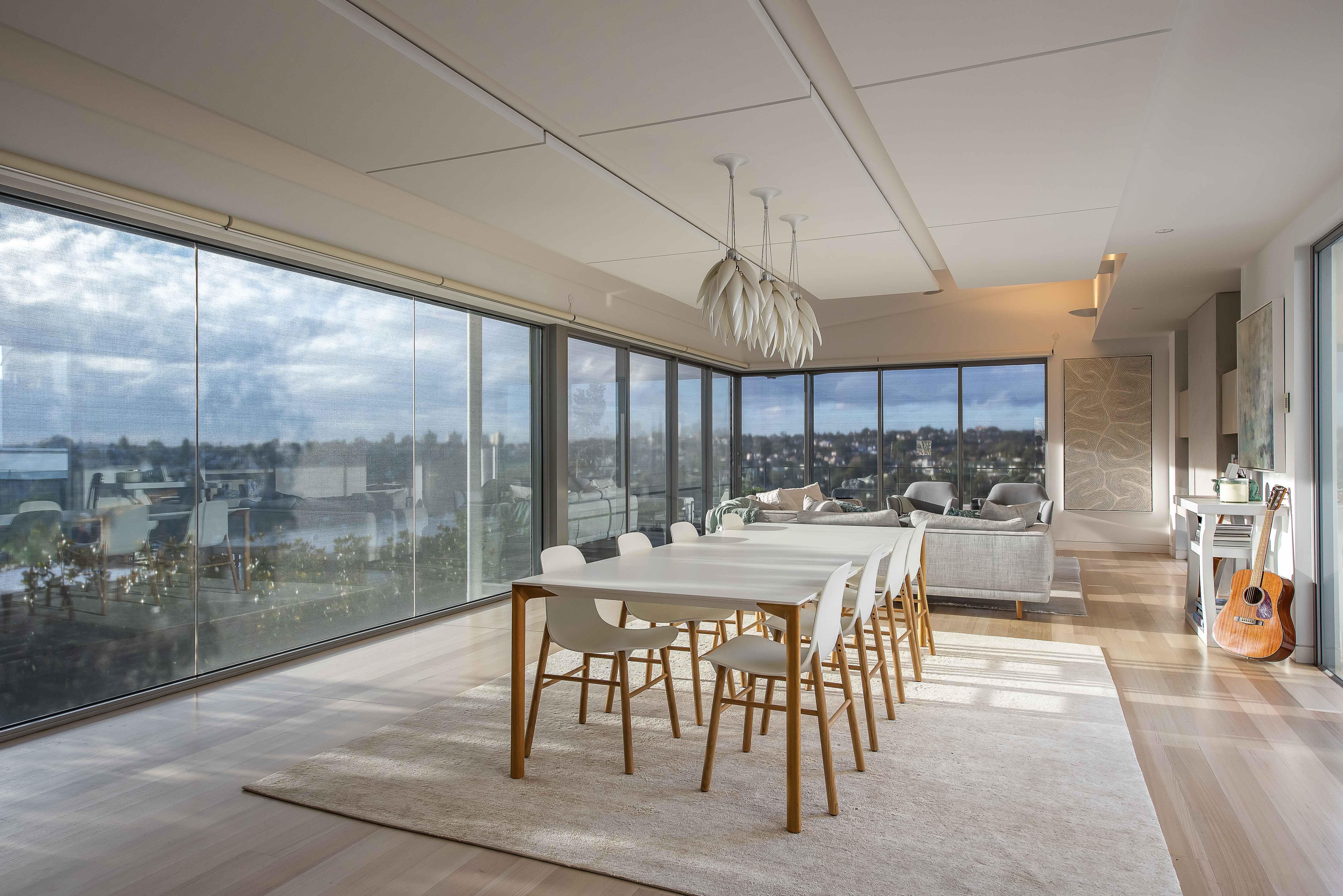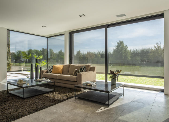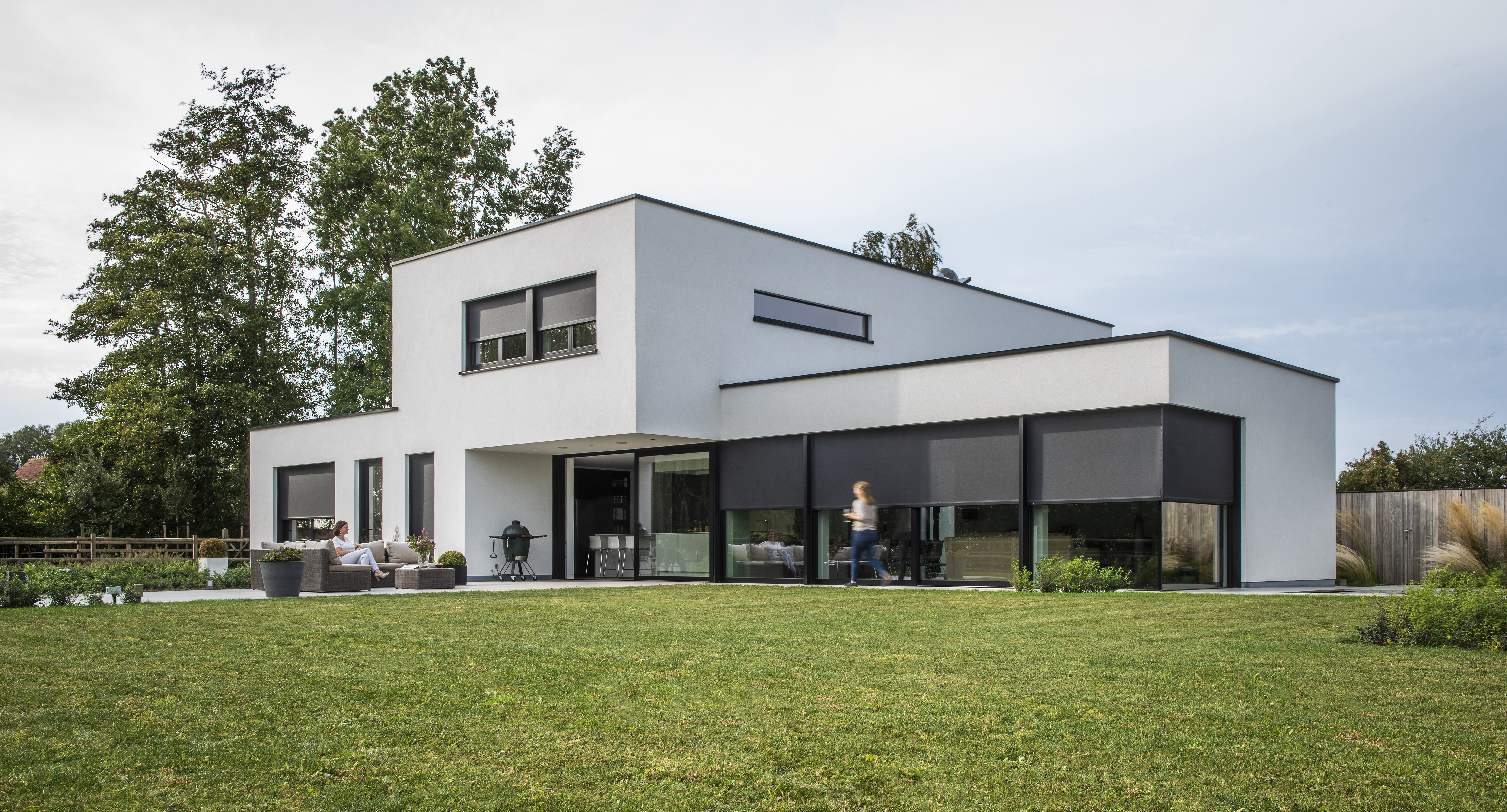 Le store de protection solaire extérieur de Renson est idéal pour des applications comportant des fenêtres d'angle sans cadre pour lesquelles des stores conventionnels n'apportent pas la solution adéquate. Les deux côtés du système peuvent être enroulés ou déroulés simultanément et permettent l'ombrage parfait du lieu de vie ou de travail, sans perte de vue sur le panorama autour du bâtiment. Cette solution est quasi invisible dans l'architecture du bâtiment. Le caisson et les coulisses peuvent être dissimulés discrètement et même la barre de charge disparaît dans le caisson lorsque le store est entièrement enroulé.