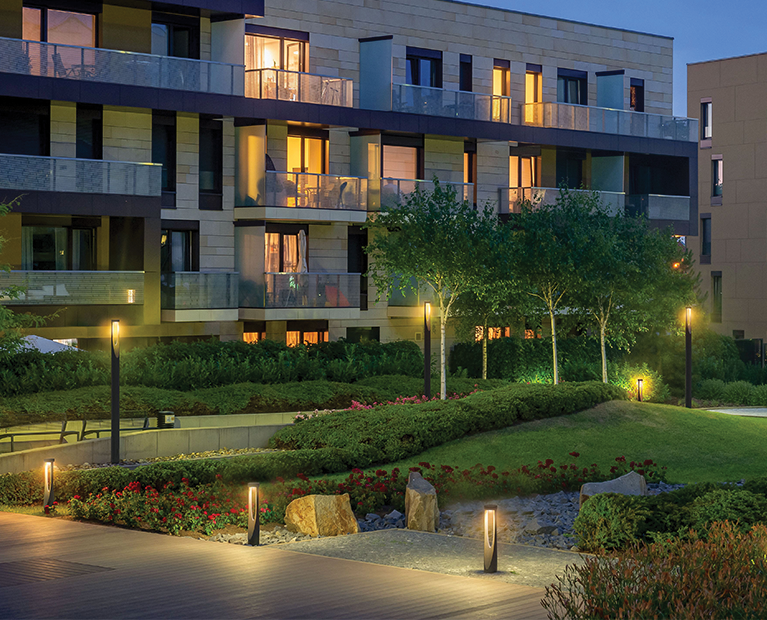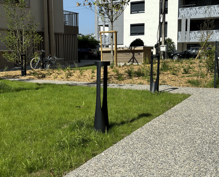 Borne et mât équipé d'une LED COB pour un éclairage architectural à haute efficacité lumineuse. Luminaires entièrement réparables. Pour un effet de gamme harmonisée, possibilité d'installation à 1m ou 4m de hauteur.