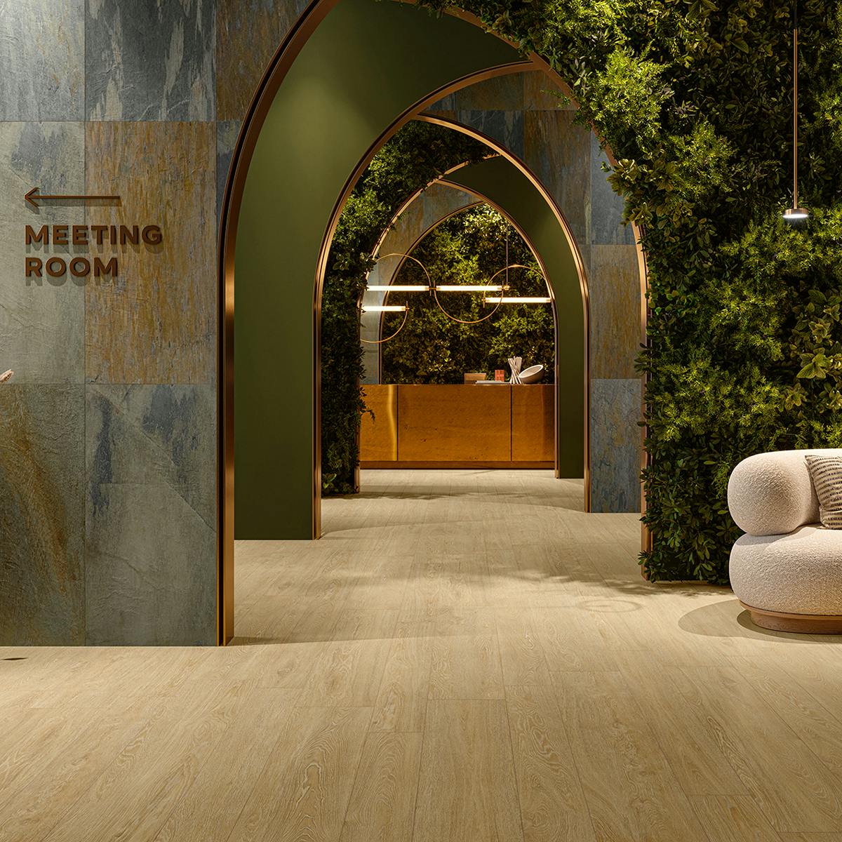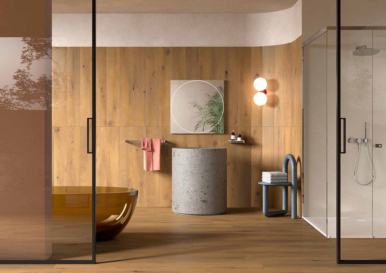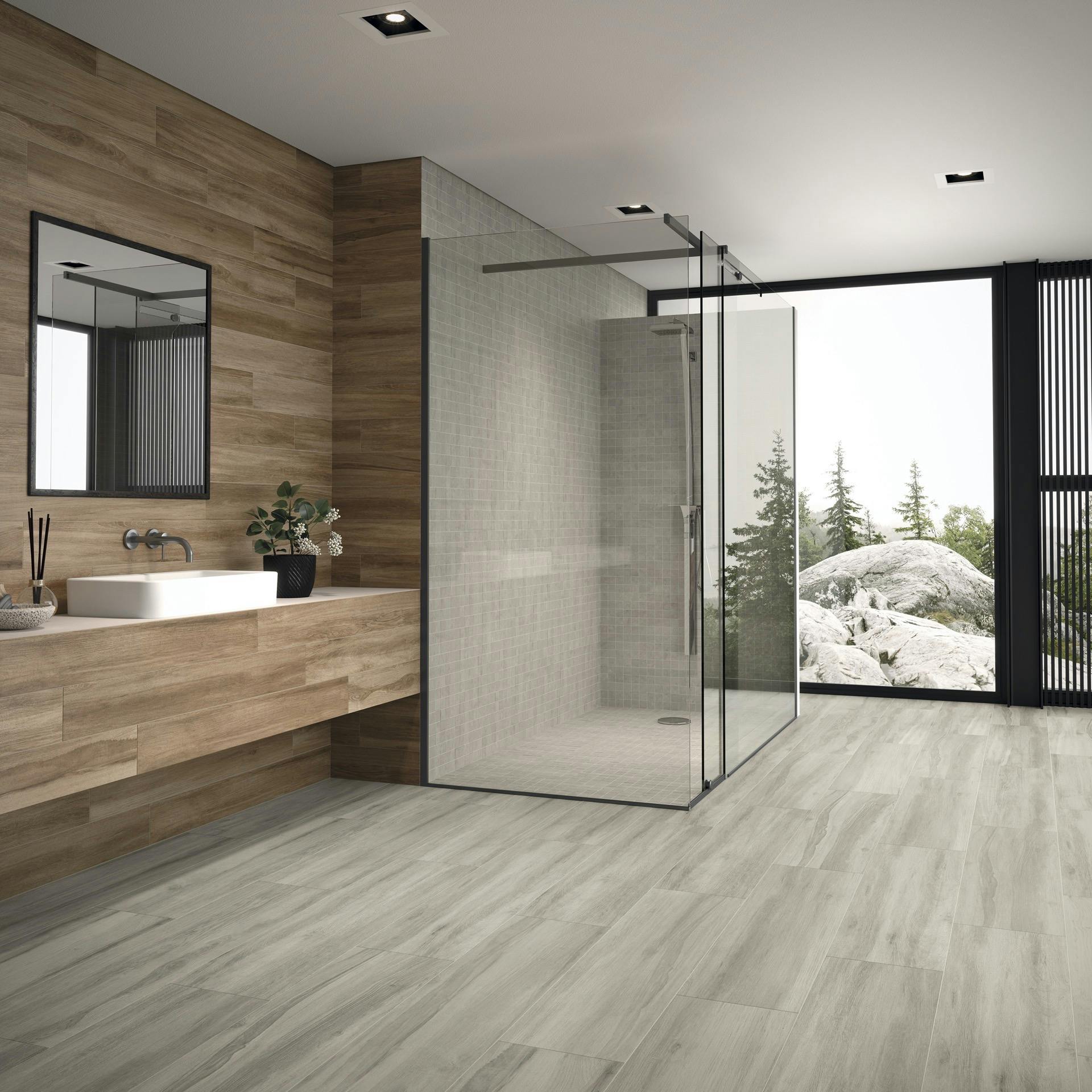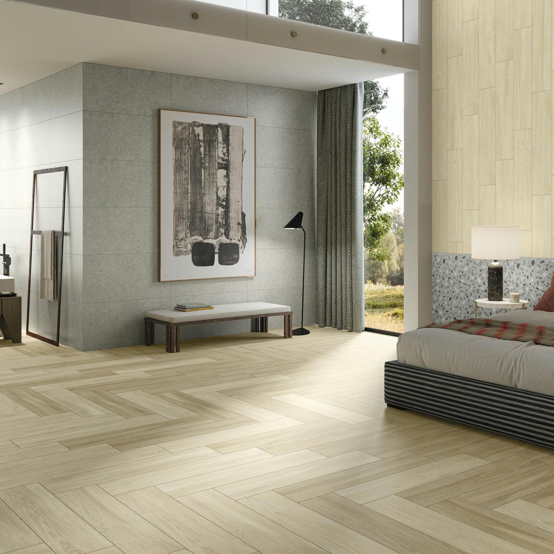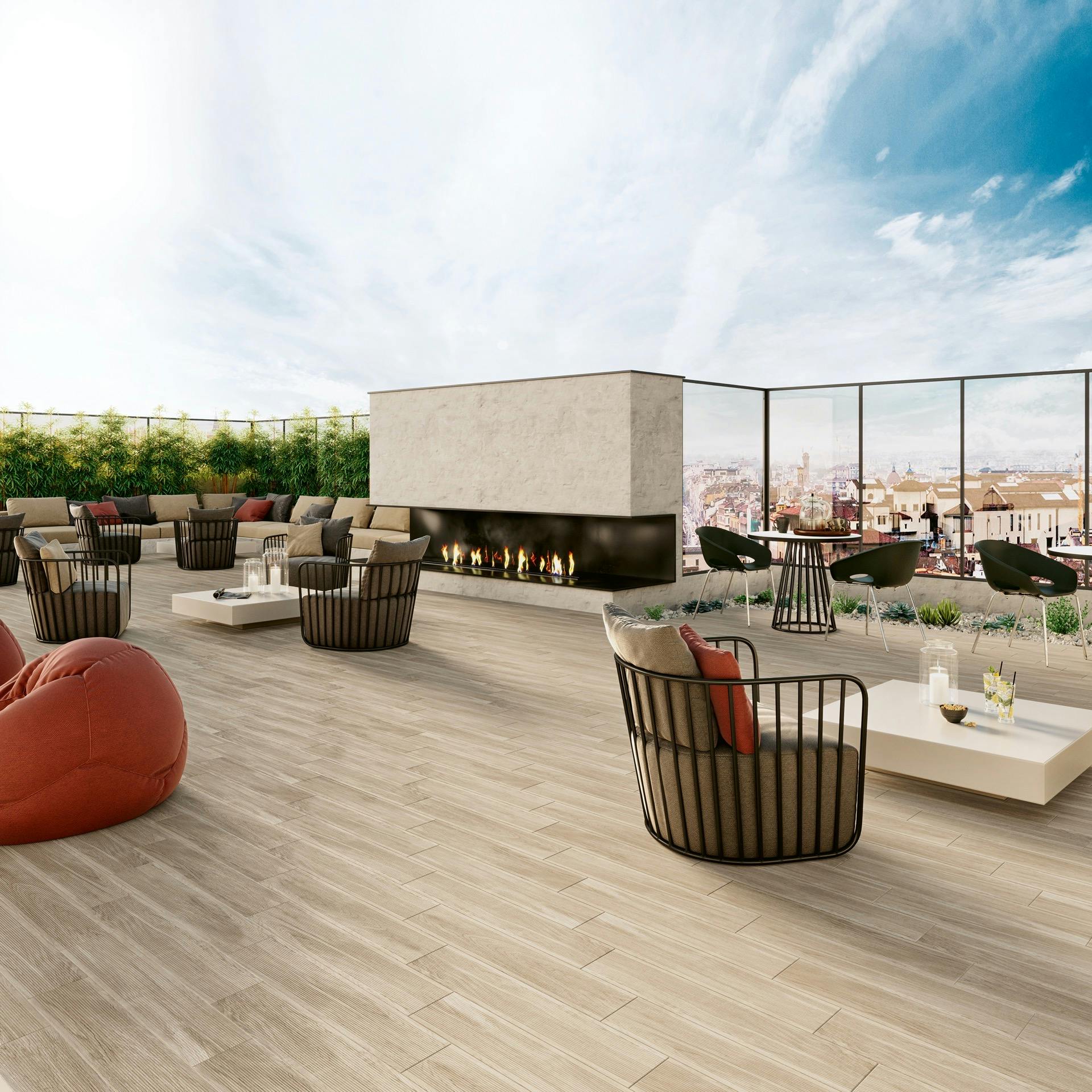 Carrelage avec l'effet du bois et du parquet et un relief doux qui recrée la texture naturelle. Pour pose au sols et murs, dans des espaces intérieurs et extérieurs.