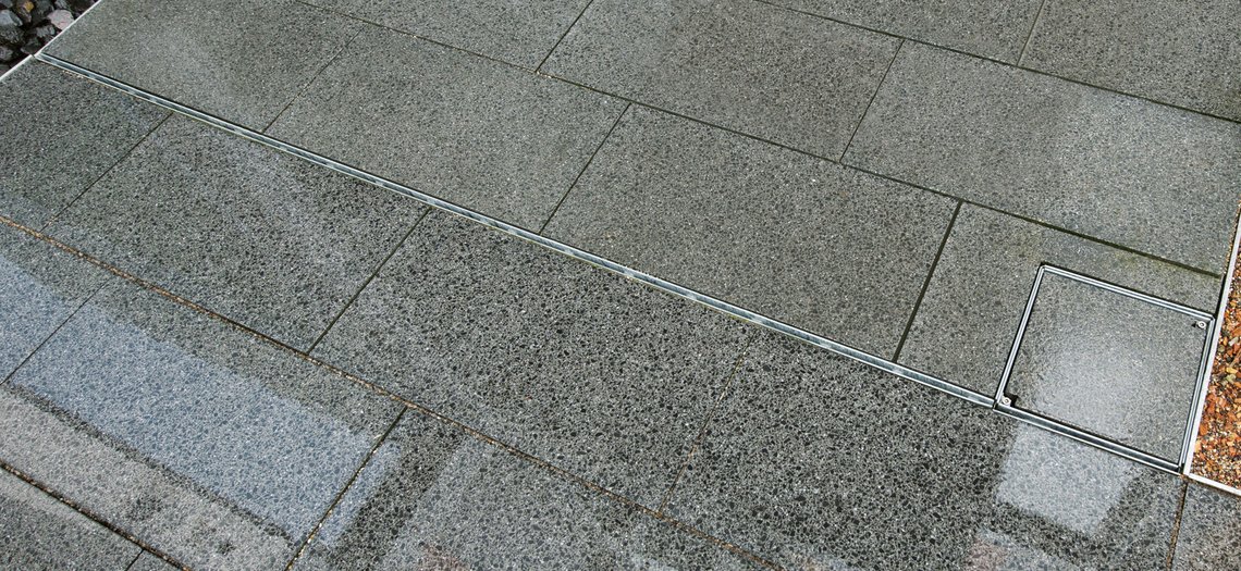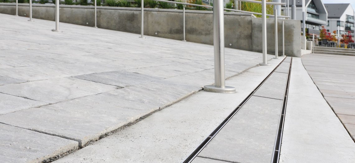 Discret ou performant ? Pourquoi choisir quand les deux sont possibles ? Si vous optez pour notre gamme de caniveaux à fente, vous n’avez aucun compromis à faire. À la surface, ces caniveaux se remarquent à peine et disparaissent presque dans l’environnement. Dans le sol en revanche, ils assurent à tout moment une gestion efficace des eaux de pluie. En fonction de vos besoins, nos produits sont toujours disponibles aussi bien en version drainage qu’évacuation avec une hauteur fixe ou réglable. En plus des caniveaux, nous pouvons vous fournir des grilles à double fente de faible hauteur et capables d’accueillir des inserts à paver.Si les systèmes ont en plus besoin d’être carrossables, nos caniveaux à fente simple ou double existent aussi en version pour charges lourdes, conformément aux exigences des catégories de charge jusqu’à D 400.