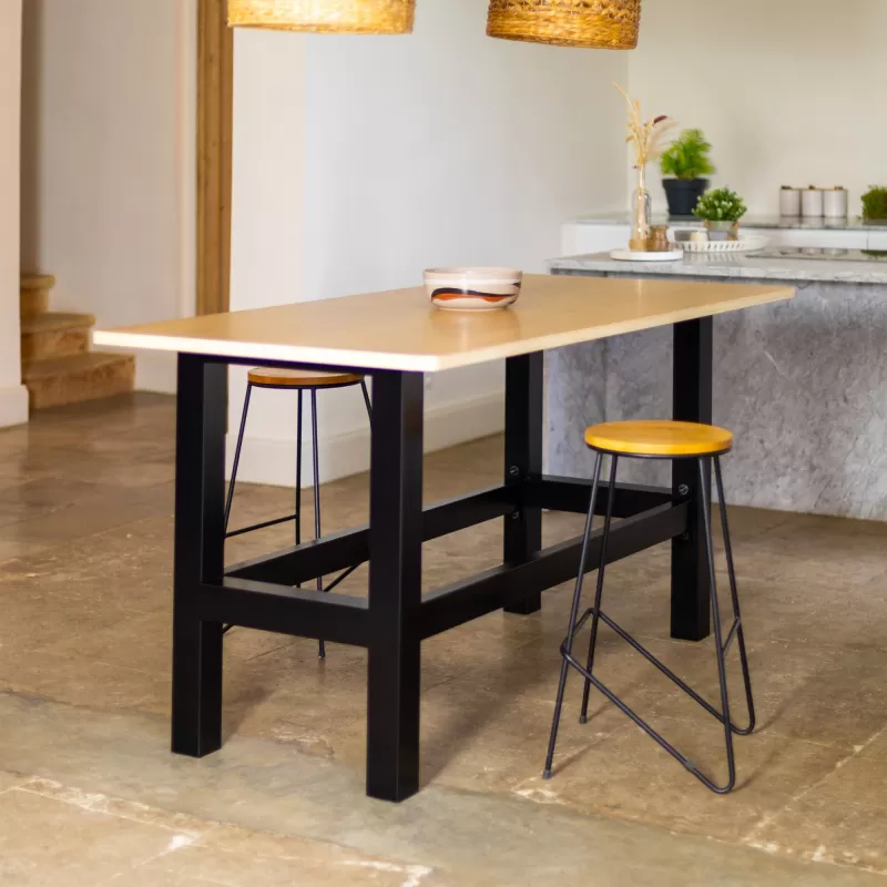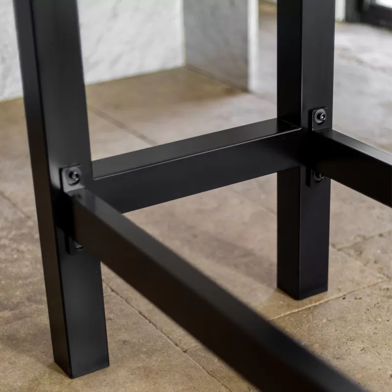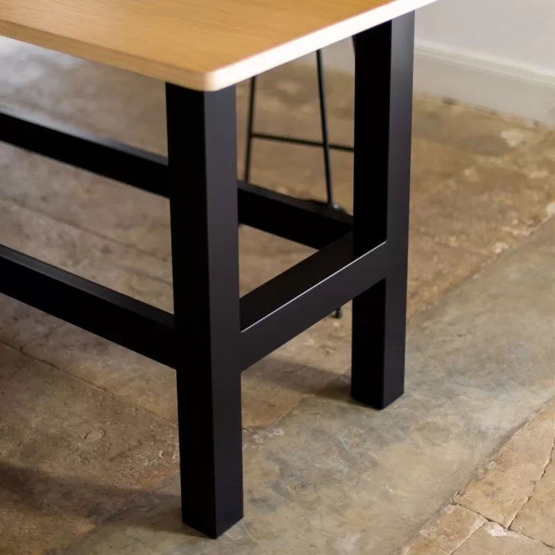 La structure de table haute est constituée de 2 pieds H reliés par deux traverses horizontales en acier, cette structure lui confère une stabilité optimale et permet de maintenir parfaitement votre plateau.