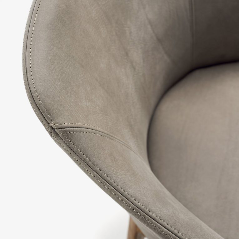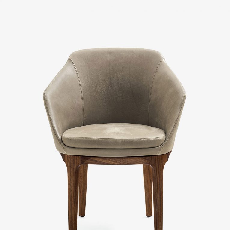 Fauteuil élégant et enveloppant, avec une coque en mousse de polyuréthane en continuité entre le dossier et les accoudoirs, équipé d'un coussin de soutien moelleux intégré à l'assise. Restylage des pieds dans la version en bois.