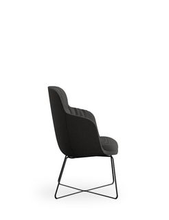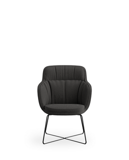 Pièces moulées en mousse à froid sur cadres métalliques ; 4 pieds en hêtre massif naturel ou teinté wengé - piètement luge noir - piètement croisé pivotant aluminium noir ; Housse fixe, coussin d’assise en mousse de polyuréthane avec housse amovible sur demande