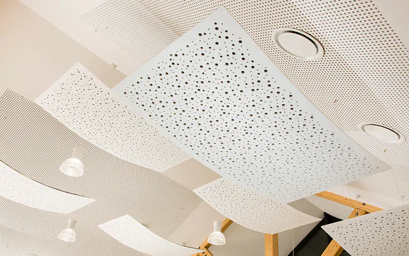 Plaque de plâtre lisse, à perforations rondes et aléatoires, de bord droit déjà poncé et primairisé, permettant la neutralisation du formaldéhyde dans l'air ambiant.