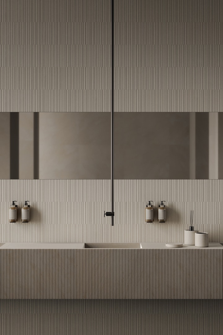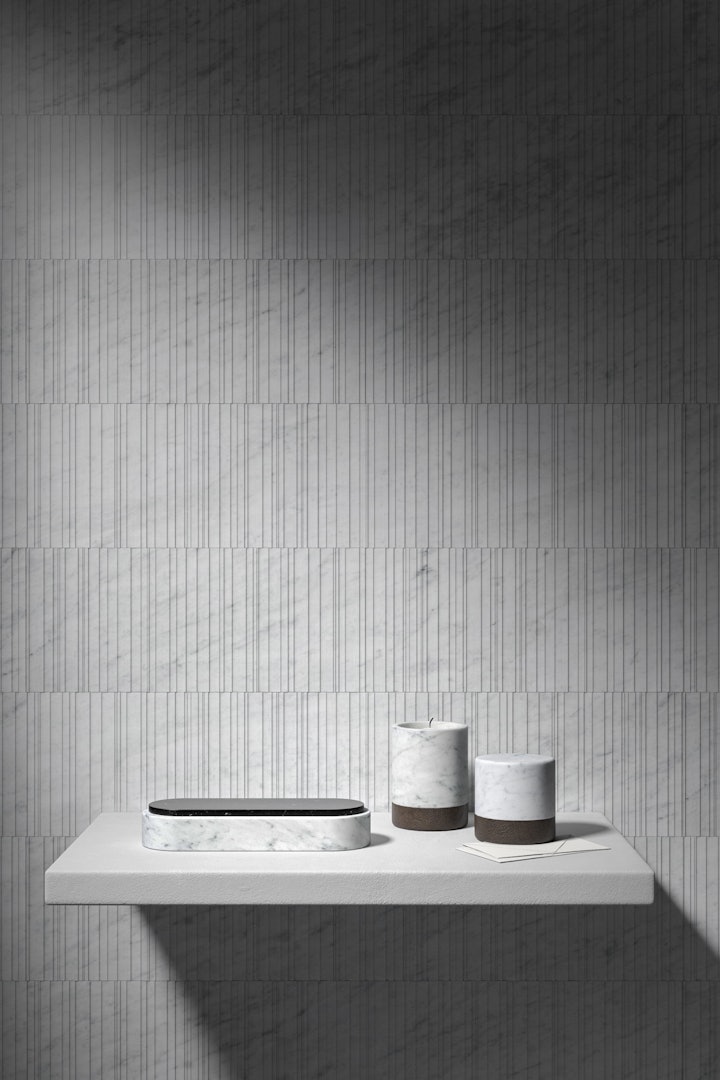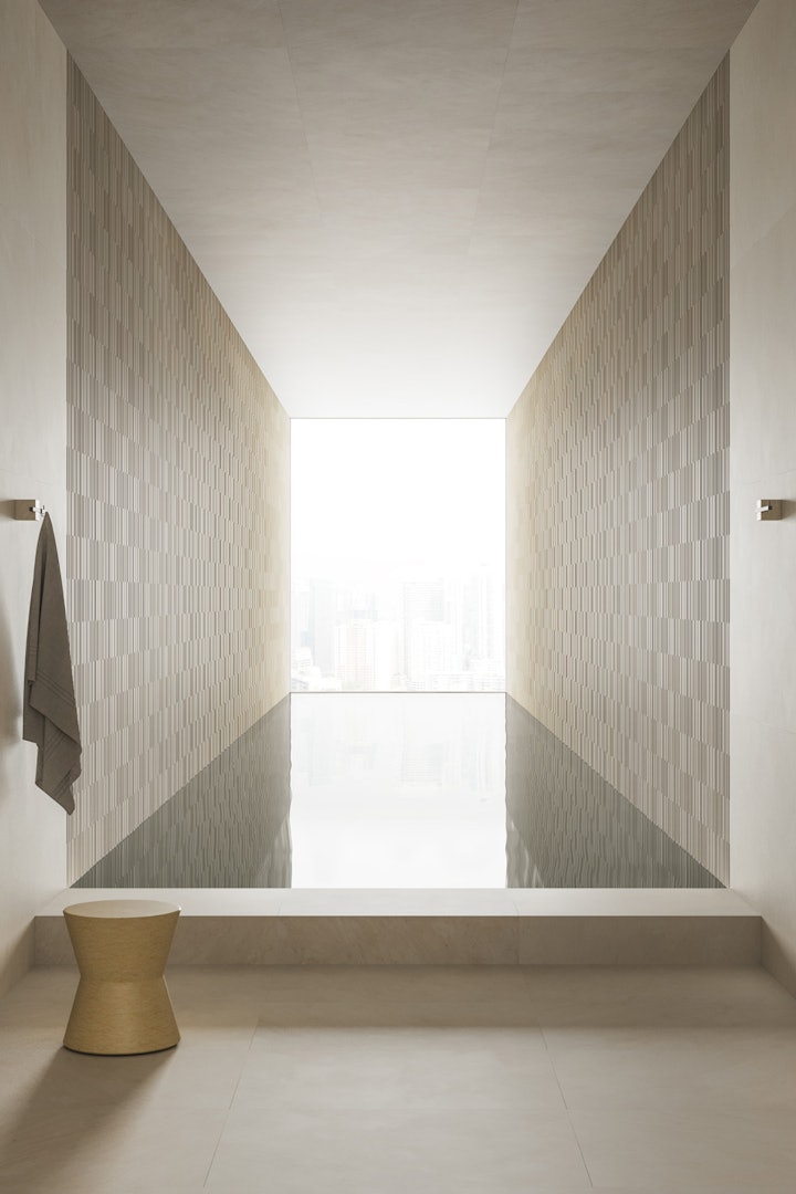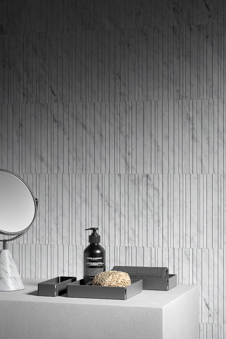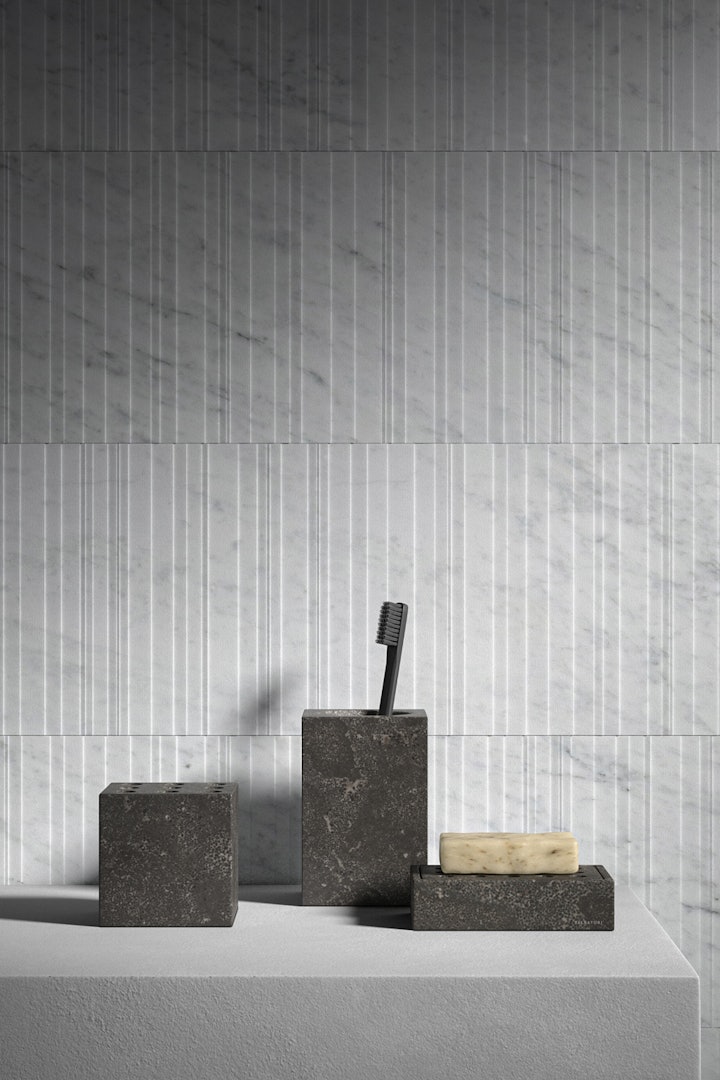Disponible en Bianco Carrara, Crema d’Orcia Select, Pietra d’Avola et Silk Georgette®, Raw peut être installé aussi bien verticalement qu’horizontalement.