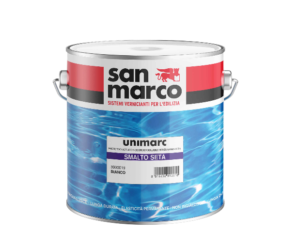 UNIMARC SMALTO SETA est une peinture-émail à l’eau de haute qualité, à effet satiné, avec des pigments colorants particulièrement résistants à la lumière. Elle est indiquée, en particulier, pour la protection du bois contre les agents atmosphériques, même dans des conditions climatiques difficiles, et contre la pollution. Elle peut être utilisée sur de nombreux types de support, en extérieur comme en intérieur : bois neuf ou déjà peint, métaux ferreux correctement prétraités, surfaces galvanisées, aluminium et alliages légers, PVC et surfaces murales. UNIMARC SMALTO SETA crée un film élastique et très résistant aux agents atmosphériques, ne jaunit pas avec le temps et permet d’obtenir des finitions pleines et homogènes, perméables à la vapeur d’eau et hydrofuges. Facile à appliquer, elle sèche rapidement et garantit un fort pouvoir couvrant, sans laisser de traces de pinceau inesthétiques. UNIMARC SMALTO SETA est sans odeur et donc adaptée même pour des applications en intérieur. Disponible dans une gamme large et complète de couleurs claires, pastel, vives et foncées. Pour diluer le produit et nettoyer les outils une fois le travail terminé, utiliser de l’eau. Produit réalisé en tenant compte de la durabilité de l’environnement. Si nécessaire, éliminer complètement les anciennes peintures ; pour ce faire, nous suggérons d’employer SVERNICIATORE SM10.