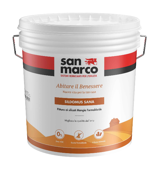 SILDOMUS SANA est une peinture à l’eau pour intérieur, à base de silicates, respirante et lumineuse, grâce à son très haut degré de blancheur. Elle est indiquée pour les murs et les plafonds de toutes les pièces et s’applique sur des surfaces neuves ou déjà peintes. SILDOMUS SANA protège contre les moisissures, est sans COV et permet, grâce à sa formule « anti-formaldéhyde » innovante, de capturer et de transformer le formaldéhyde présent dans les locaux en composés stables et inoffensifs, ce qui optimise le bien-être au sein du logement. Cette peinture est particulièrement adaptée aux locaux fréquentés par des personnes sensibles. SILDOMUS SANA permet d’obtenir des finitions soignées, d’aspect opaque et uniforme, elle régule l’humidité et ne s’écaille pas. Disponible dans des tons de couleurs clairs, pastel et d’intensité moyenne. Pour diluer le produit et nettoyer les outils une fois le travail terminé, utiliser de l’eau. Produit réalisé en tenant compte de la durabilité de l’environnement. En cas de supports avec d’anciennes peintures ou particulièrement absorbants, il est conseillé d’appliquer une couche de FISSATIVO ATOMO avant de peindre. En cas de moisissures, avant la mise en peinture, il faut nettoyer les surfaces avec COMBAT 222 ; pour une action de préservation, il est conseillé d’effectuer aussi le traitement avec COMBAT 333. En cas de légères moisissures, on peut prétraiter avec le fixateur COMBAT FIX, puis procéder à la mise en peinture.