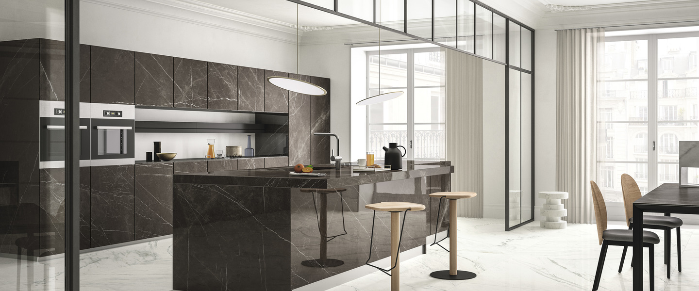 Pietra Grey, la più foncée des surfaces de la collection SapienStone, particulièrement brillante et mise en valeur par de fines veines blanches, confère à n’importe quel local un look raffiné et métropolitain. Disponible dans les finitions naturelle ou polie.