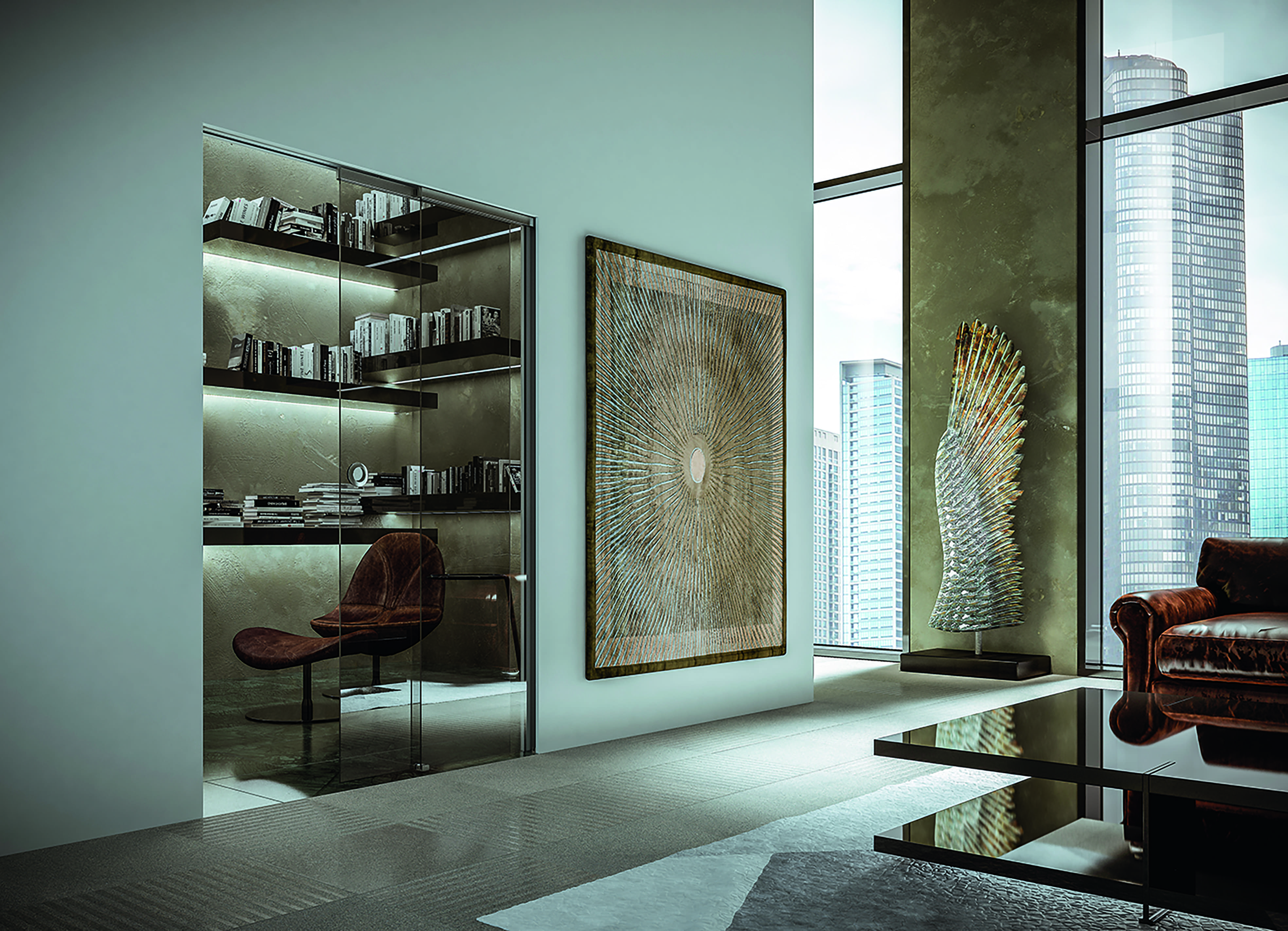 Dual est le galandage capable d'accueillir deux portes coulissantes en verre à l'intérieur d'un seul caisson, reliées entre elles par un système d'entraînement.