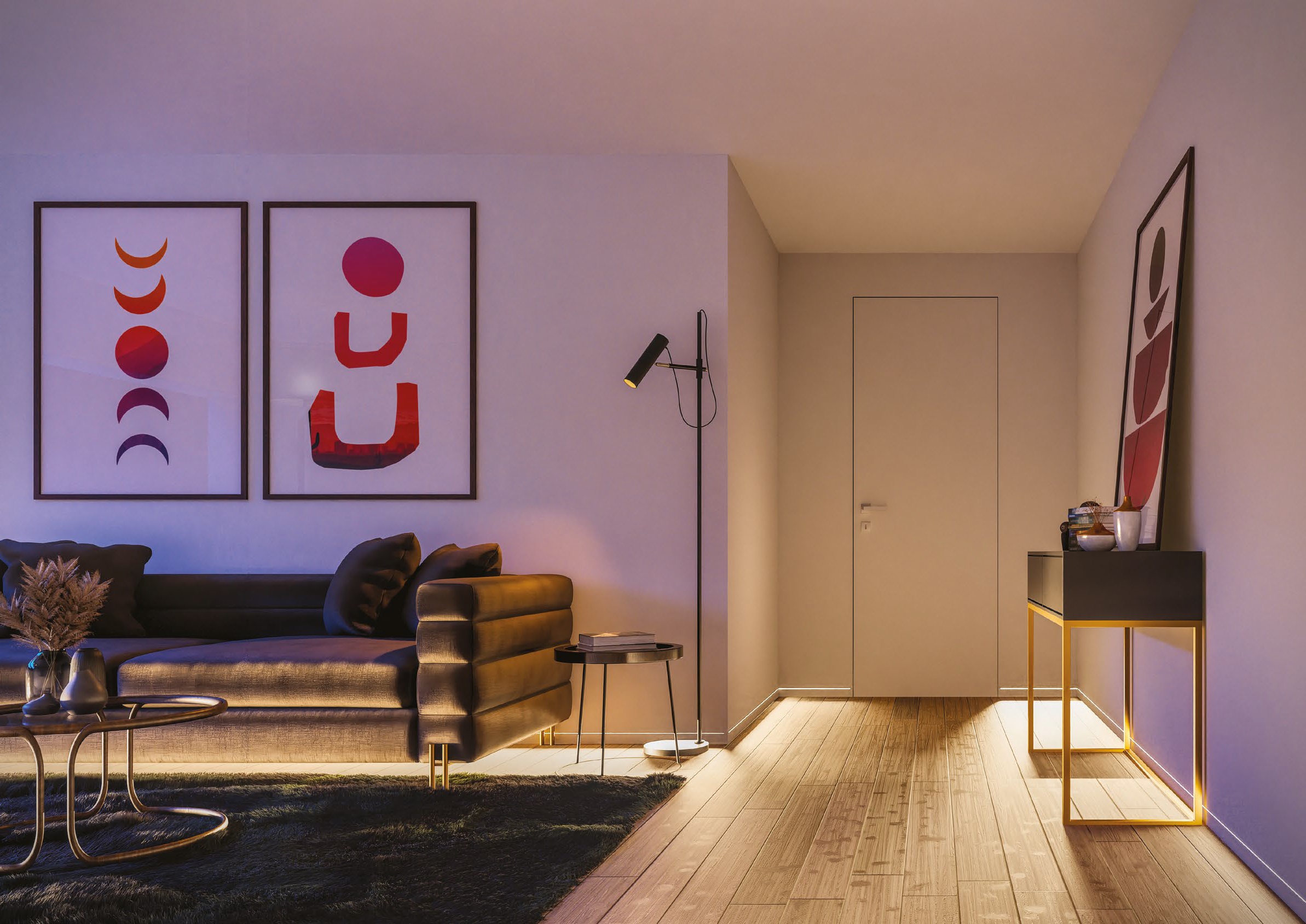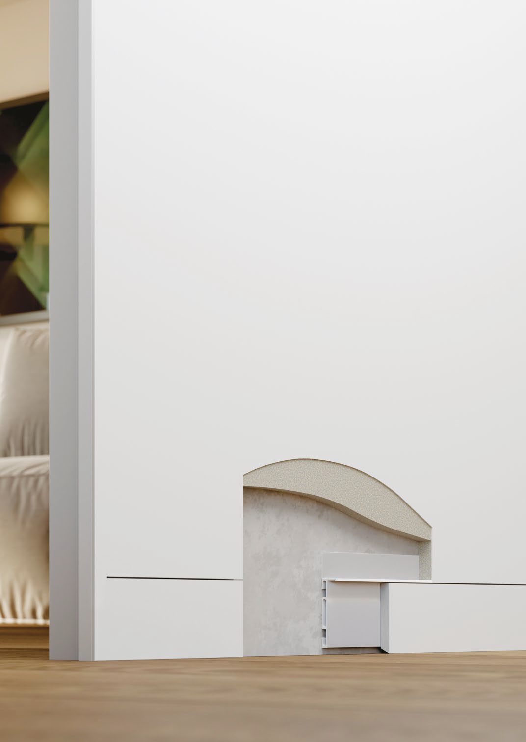 La plinthe à fleur de mur est une solution qui complète et termine la gamme à fleur de mur Scrigno. Elle se distingue par son souci du détail et son design minimaliste. Il s'agit d'une solution polyvalente qui s'adapte aussi bien aux systèmes coulissants qu'aux systèmes battants et qui peut être combinée avec l'insertion de bandes LED. Non seulement elle protège contre les chocs, mais elle complète également l'aspect des pièces grâce à un entourage complètement intégré dans le mur, répondant ainsi à diverses exigences esthétiques et fonctionnelles.