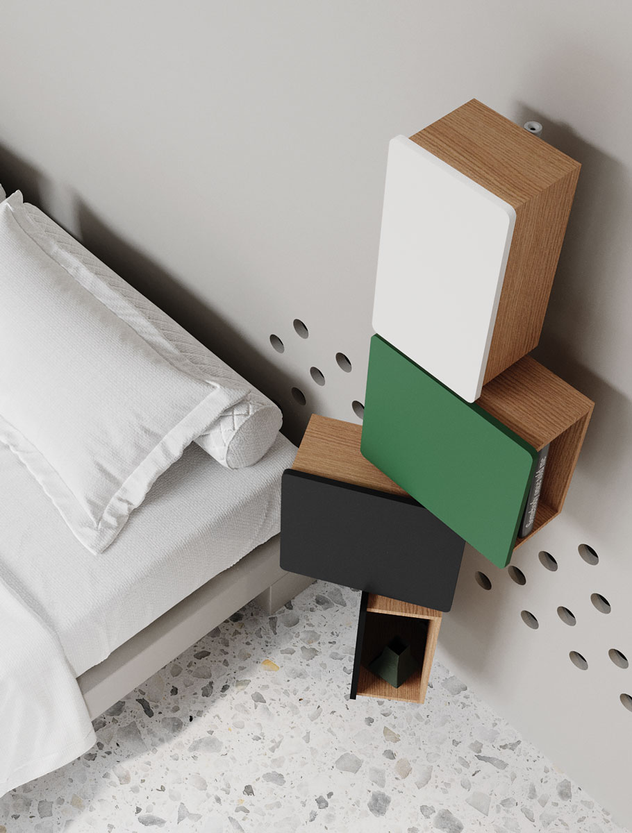 Lookin est un système de conteneurs (rectangulaires H 33,5 – carrés H 27,5 cm) tournant sur une colonne fixée au mur en deux points. Il a une profondeur de 12 cm. Structure disponible en placage chêne V16 (bois), chêne teinté gris V18 ou noyer canaletto V19 et façade en Touch (laqué). Capacité par étagère 8 Kg. Le produit est livré déjà monté.