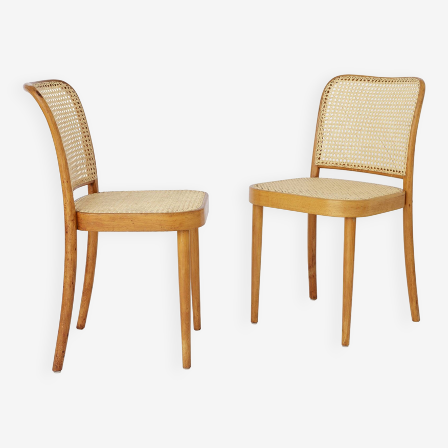 Paire de chaises en bois courbé de tchécoslovaquie par le fabricant ligna. Période de production: années 1960-1970. Le prix affiché est pour un lot de 2. Au total jusqu'à 8 chaises (4 paires) disponibles. Structure robuste en bois de hêtre. Tissage viennois renouvelé sur l'assise et le dossier. Autocollant du fabricant sous le siège.