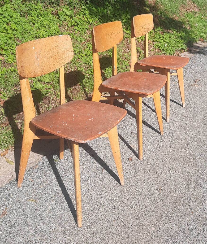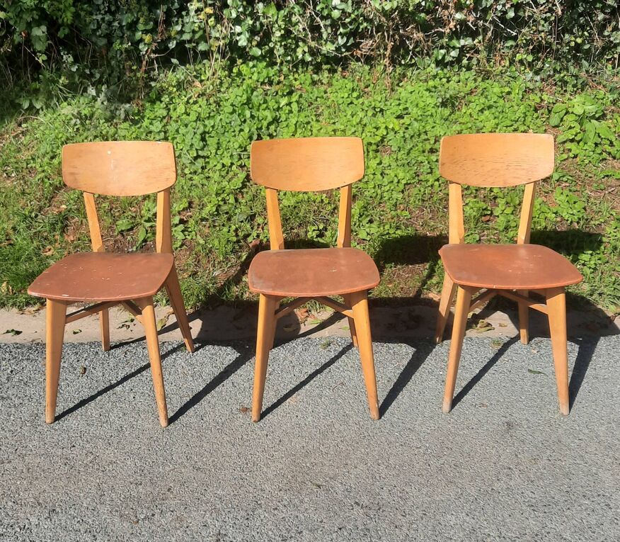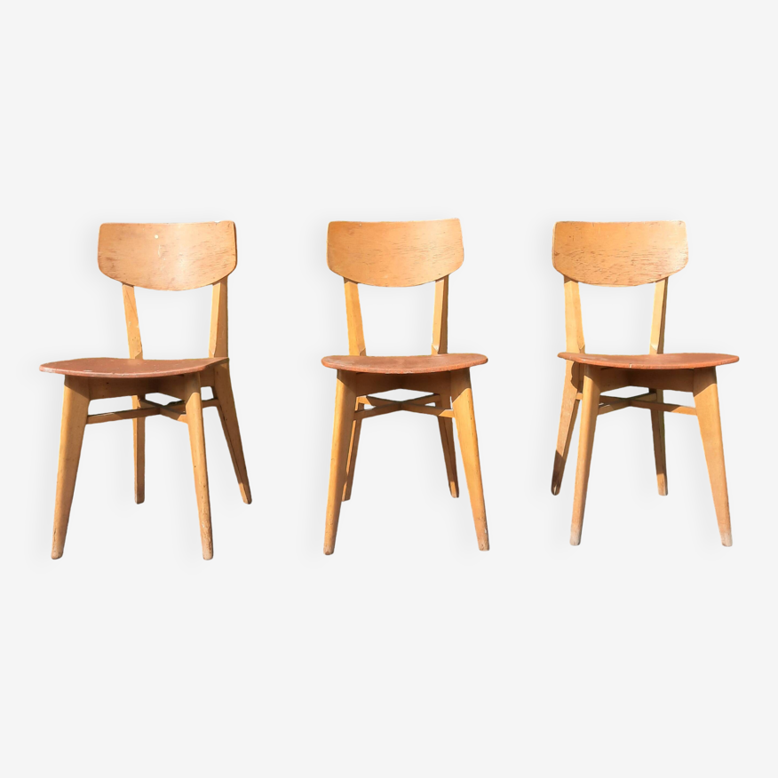Serie de 3 chaises design composées d une structure en bois massif, d une assise en skai et d un dossier en bois courbé. Fabrication des années 1950. Bon état sauf taches sur les assises.