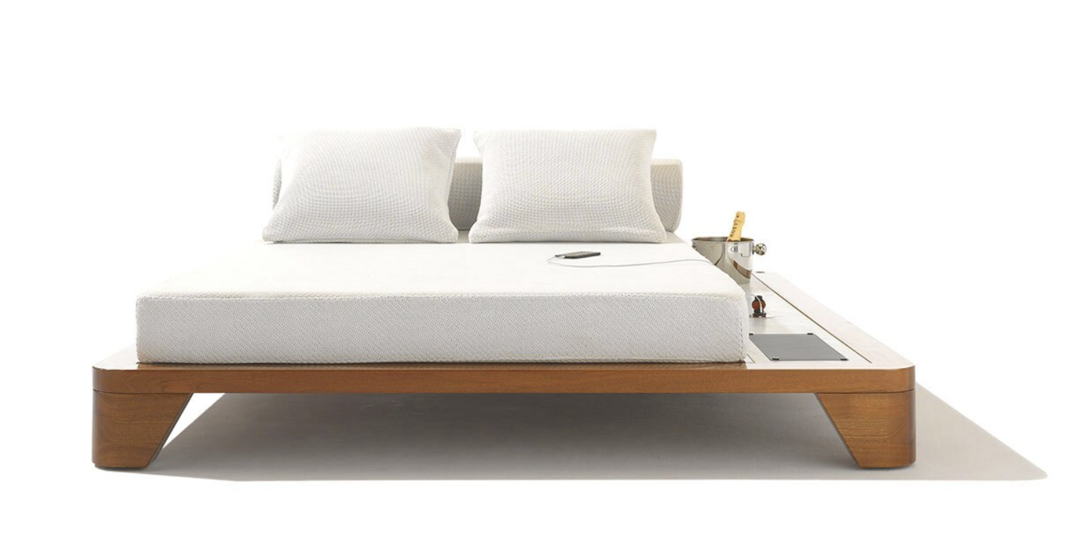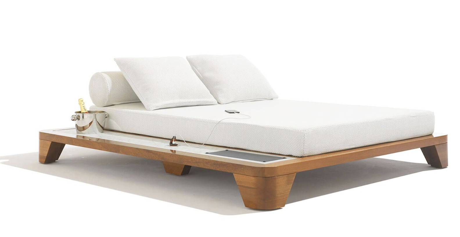 Équipé de la technologie Smartbrella, le lit de jour d’extérieur pour deux personnes Grand Belvedere met tout à portée de main. La prise USB est alimentée par un panneau solaire discret et intégré pour faciliter la recharge du téléphone, tandis qu’une table d’appoint fixe en marbre - avec porte-plante ou seau à glace en option - longe le lit pour garder les affaires hors du sol. Le bois dur d’acajou de qualité supérieure forme le cadre large empilable signature du Grand Belvedere, qui est surmonté de coussins épais et dodus et d’un matelas double volumineux dans lequel s’enfoncer.