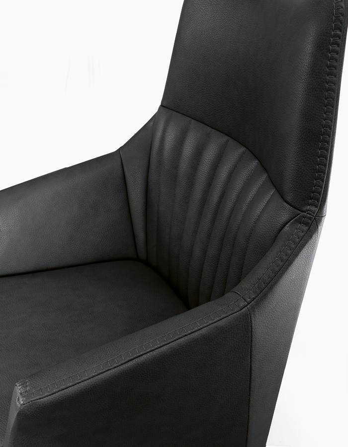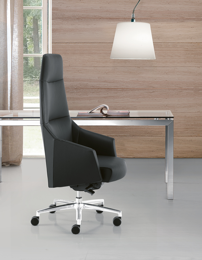 Famille de fauteuils proposée avec tapisserie PLAIN (sans piqures sur le devant) et STRIP (avec piqures sur le devant). La série est composée par: avec Synchro SLYD fauteuil avec têtière et dossier haut, avec basculant