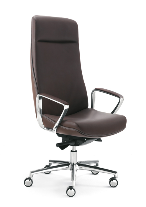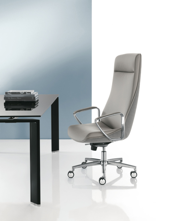 Fauteuil direction avec tètière, dossier haut ou moyen. Mécanisme: synchrone SY109 (autorégulateur) avec traslation de l’assise (op. SLYJ) et basculant centré A19.