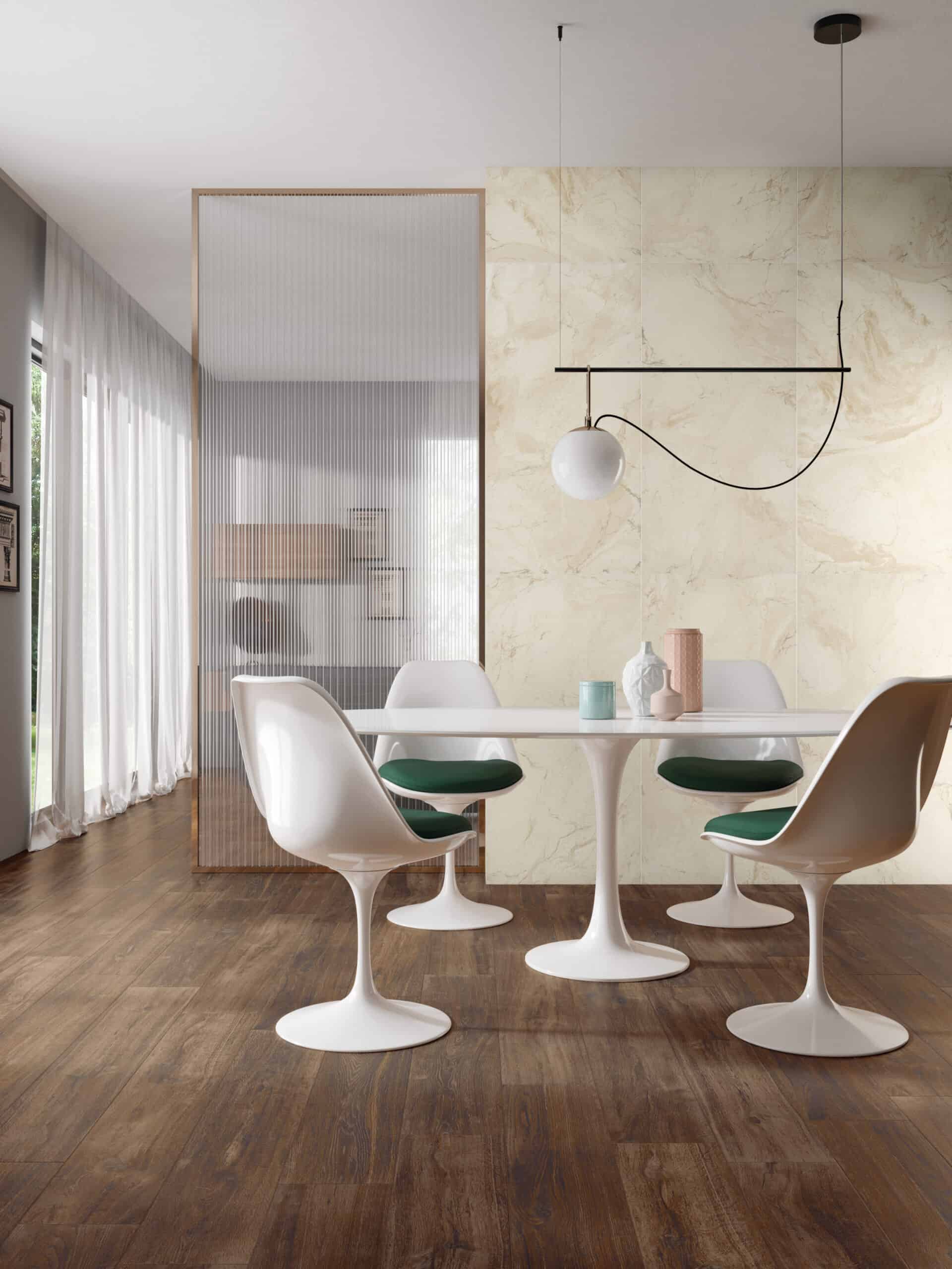 Disponible en quatre variations chromatiques, il transfère toute la beauté de la nature sur les revêtements, avec un effet de matière extraordinaire. La collection est également parfaitement combinée avec d’autres matériaux tels que l’alter ego Mus_eum ou des matériaux inspirés du bois ou du métal. La surface « Honed » donne aux dalles un reflet semi-brillant caractéristique. C’est une finition « Soft-Touch », avec un toucher doux et soyeux qui rend la matière agréable au toucher. La texture lisse et légèrement opaque donne au produit l’aspect typique du marbre naturel.