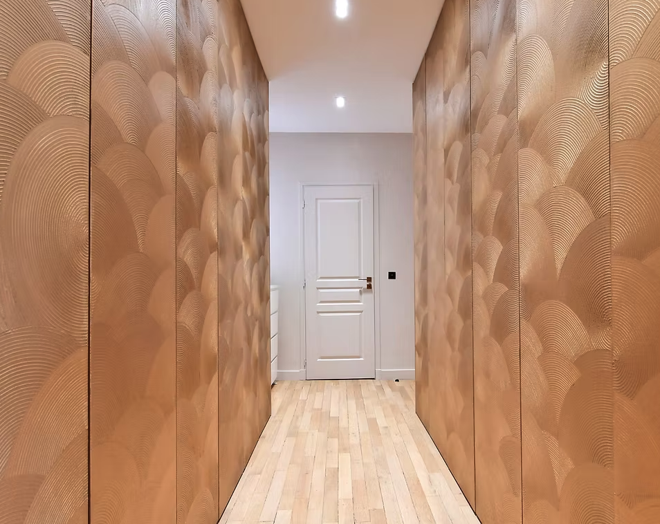 Nous utilisons divers procédés créatifs : application de tissus texturés, utilisation d’empreintes exclusives, conception d'outils sur mesure et mélange d'agrégats minéraux avec d'autres matériaux. Nous proposons ainsi une large palette d’effets décoratifs et de finitions personnalisées, à découvrir en nous contactant directement.