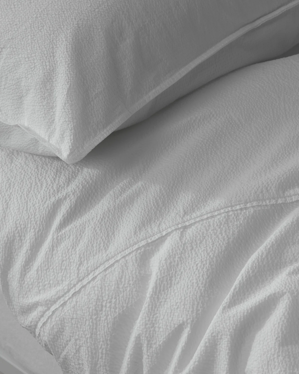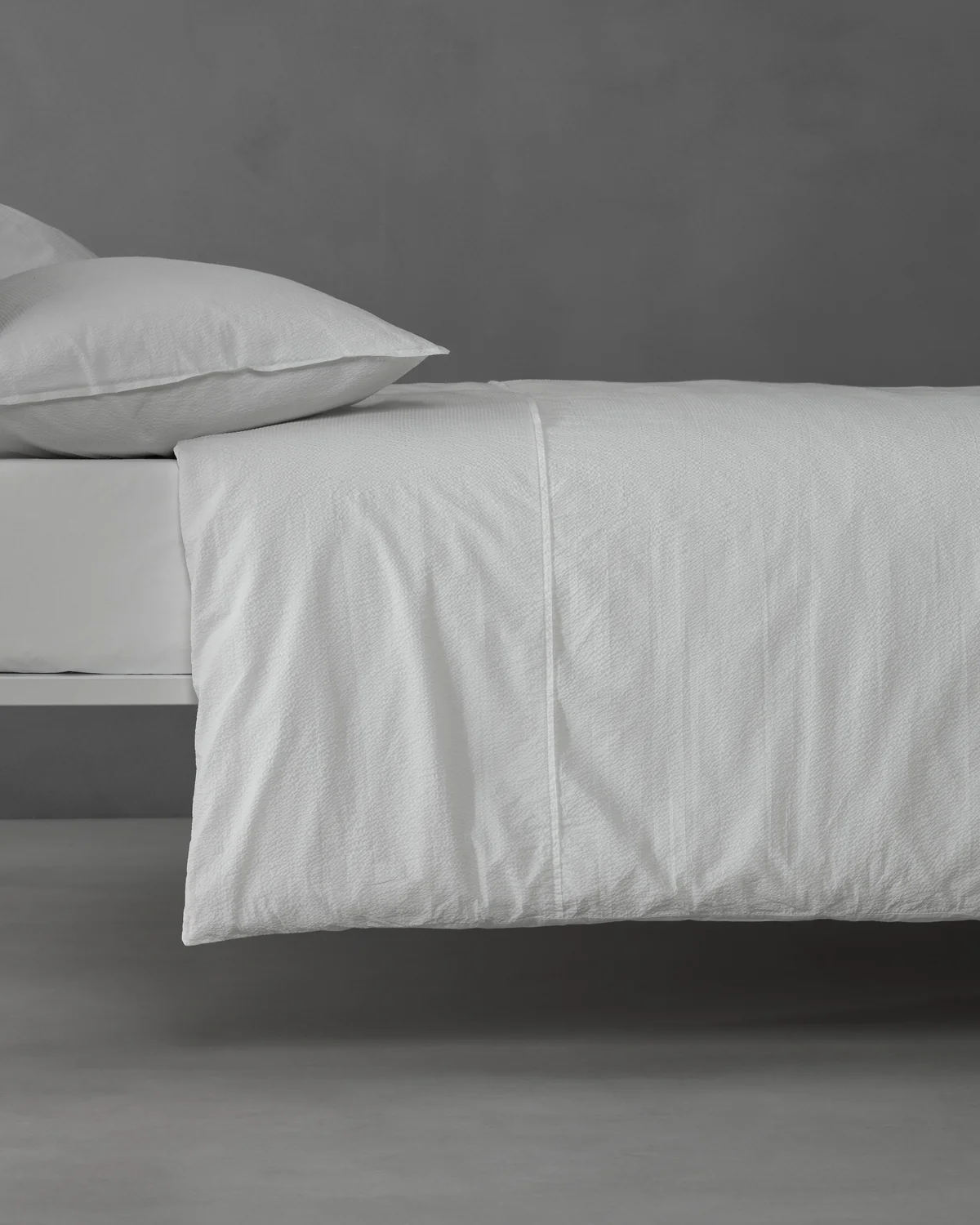 Ondulée et ondulée, la housse de couette en pur coton SIRE est capable d’habiller le lit de fraîcheur et de tridimensionnalité. Il doit son nom à la technique du seersucker, capable de faire croquer un simple voile de coton. Disponible en une seule variante en blanc optique, il peut être facilement combiné avec les blancs plus chauds des couvertures.