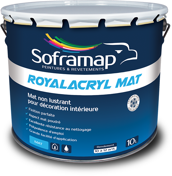 Le produit ROYALACRYL MAT du fabricant SOFRAMAP classé dans la catégorie Revêtement mural > Enduits - peintures - lasures et vernis > Peintures de finition - décoratives est référencé dans la Matériauthèque digitale Materiaux.archi.