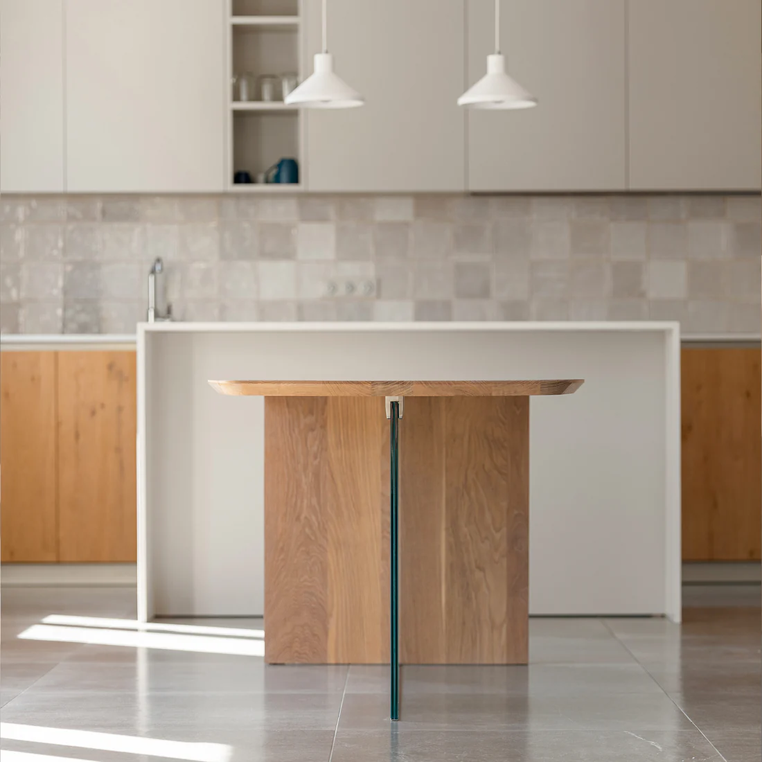 Son pied en verre transparent, subtilement déconcertant, fusionne légèreté et stabilité pour créer une illusion de déséquilibre.
