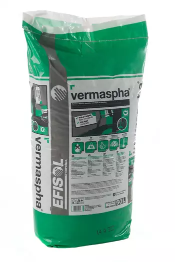 VERMASPHA® est constitué d'un mélange de grains de vermiculite enrobée de bitume. Isolant acoustique aux bruits d’impacts, Vermaspha® est aussi un isolant thermique (= 0,076 W/mK). Il permet de réduire la fuite de calories entre étages et de diminuer les consommations d’énergie.