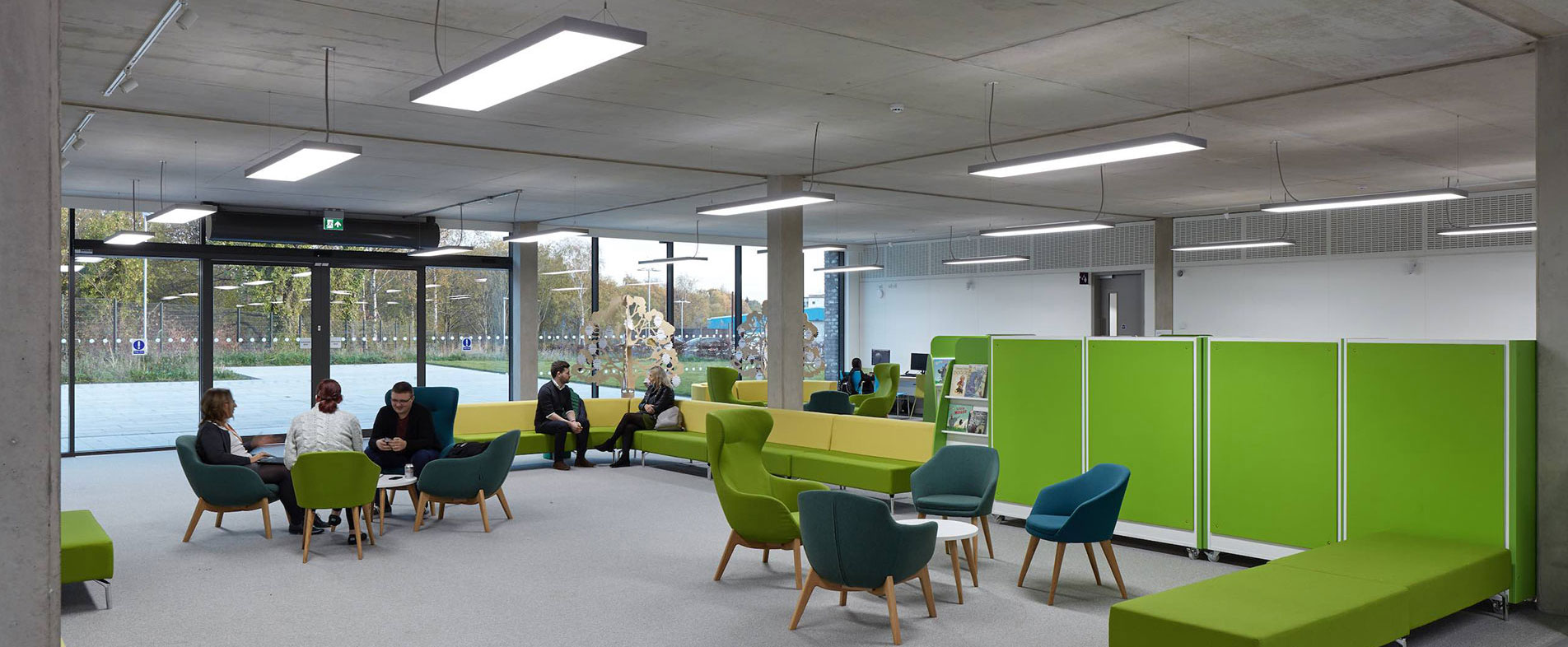 Grâce aux grandes surfaces lumineuses des types Stora rectangulaires et ronds, de très bonnes valeurs de protection contre l’éblouissement sont obtenues en combinaison avec les couvertures prismatiques. Le composant indirect en option permet un éclairage actif du plafond – monochrome ou blanc dynamique en Tunable White.