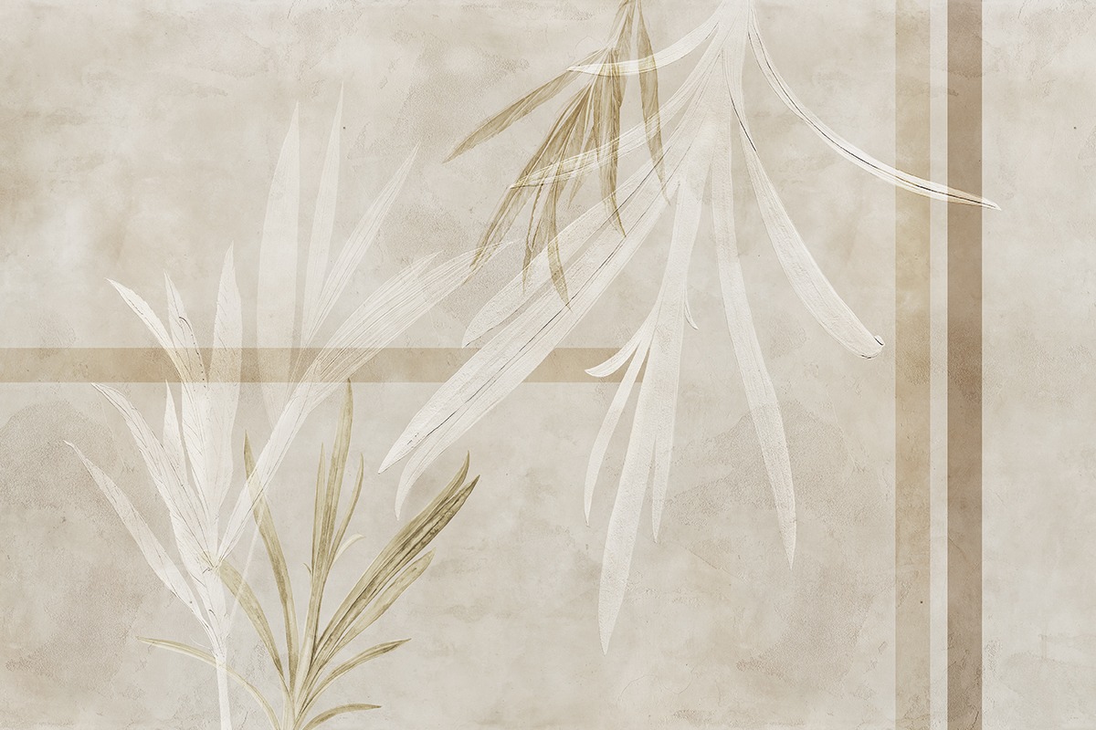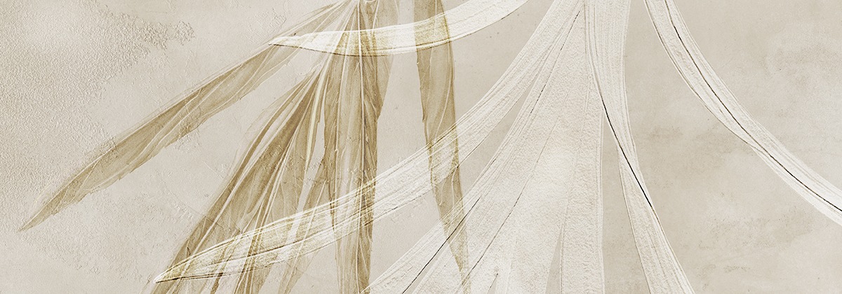 La légèreté du signe et la couleur douce rendent les palmiers peints à la main aussi précieux que des feuilles d’or, superposés à d’épaisses bandes géométriques de couleurs terreuses.
