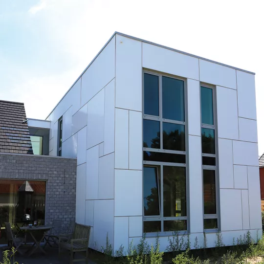 Le panneau en bois composite Trespa® Meteon® garantit une bonne résistance en extérieur, de par sa tenue aux intempéries et conservant ses coloris sur une longue période.