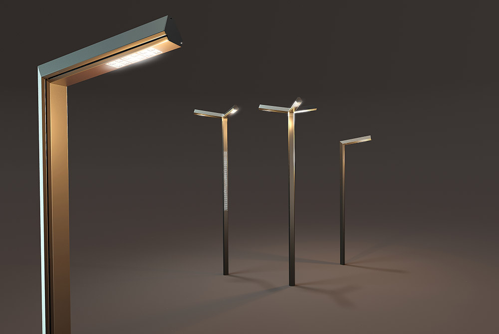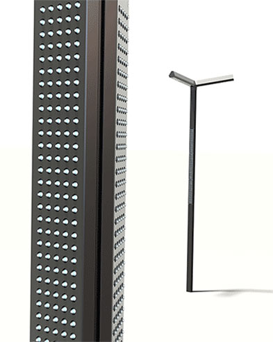 Singulier dans sa forme et ses applications, Jeny est un lampadaire au profil triangulaire, équipé de 3 rails techniques facilitant la fixation d’accessoires.