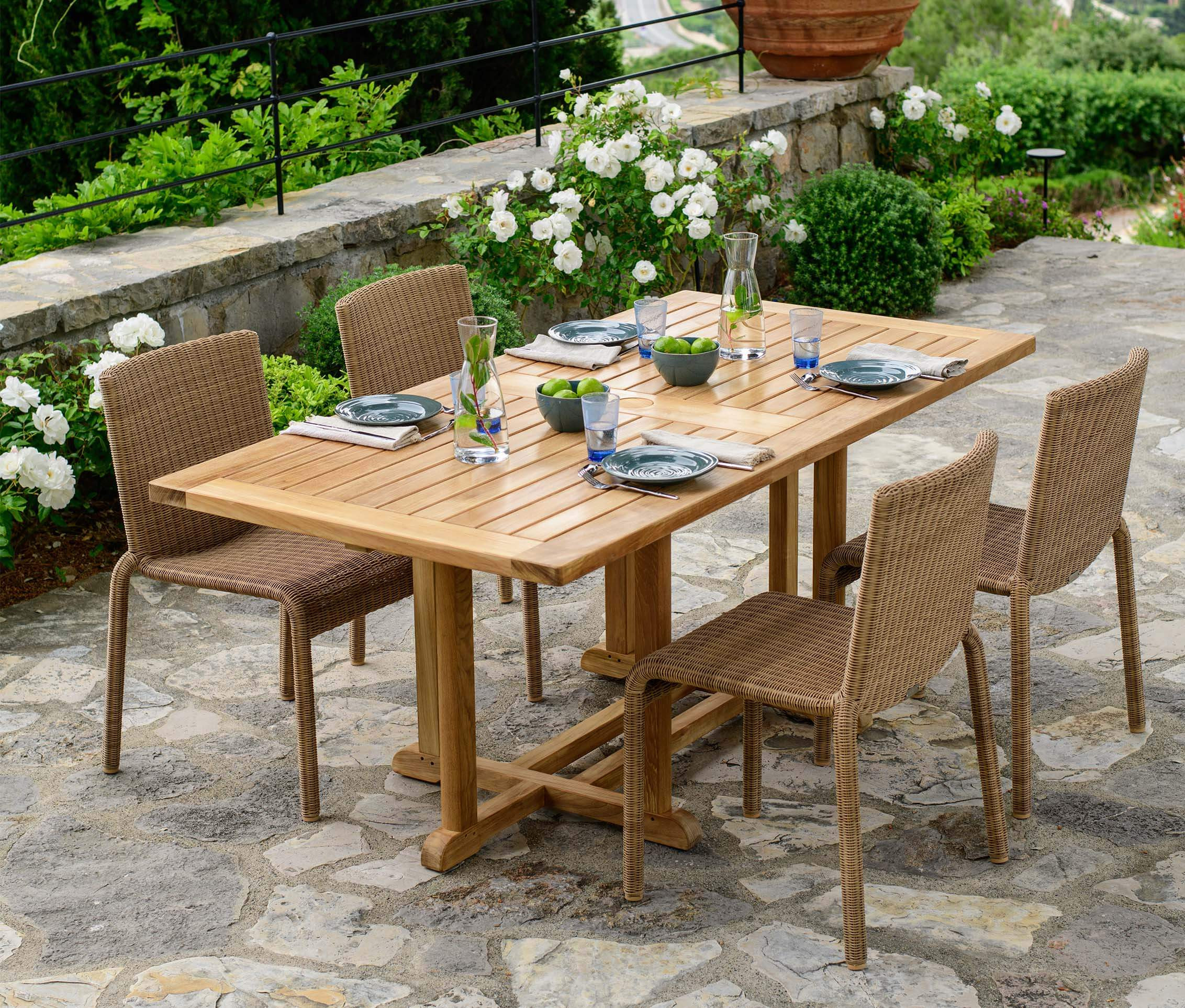 Depuis le début des années 2000, Christophe Delcourt collabore régulièrement avec Tectona dont il a su moderniser le répertoire formel. Il associe en particulier la robustesse du teck à des lignes rendues subtilement aérodynamiques par des lignes courbes et des angles adoucis.