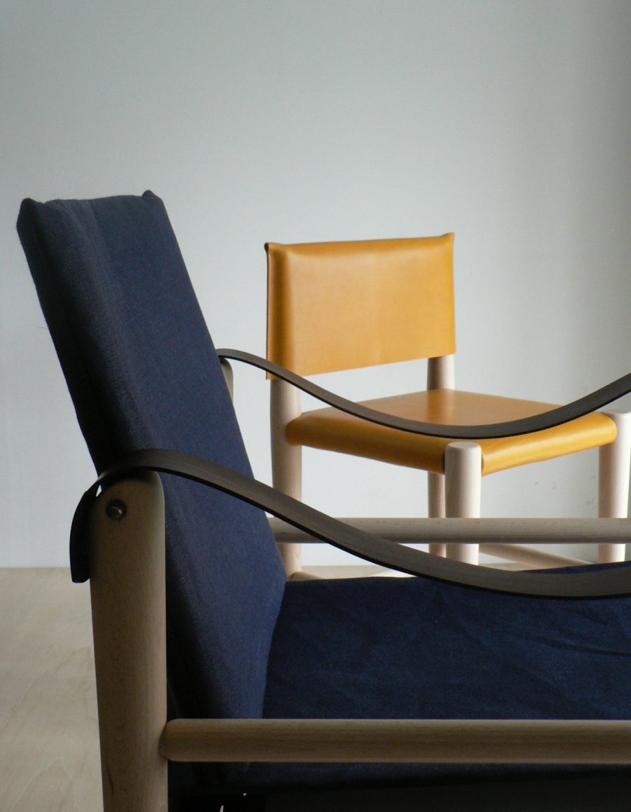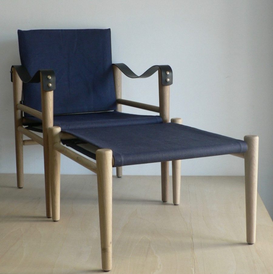 Fauteuil démontable ou entièrement collé. Couverture lin. Chêne verni.